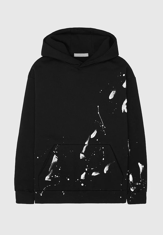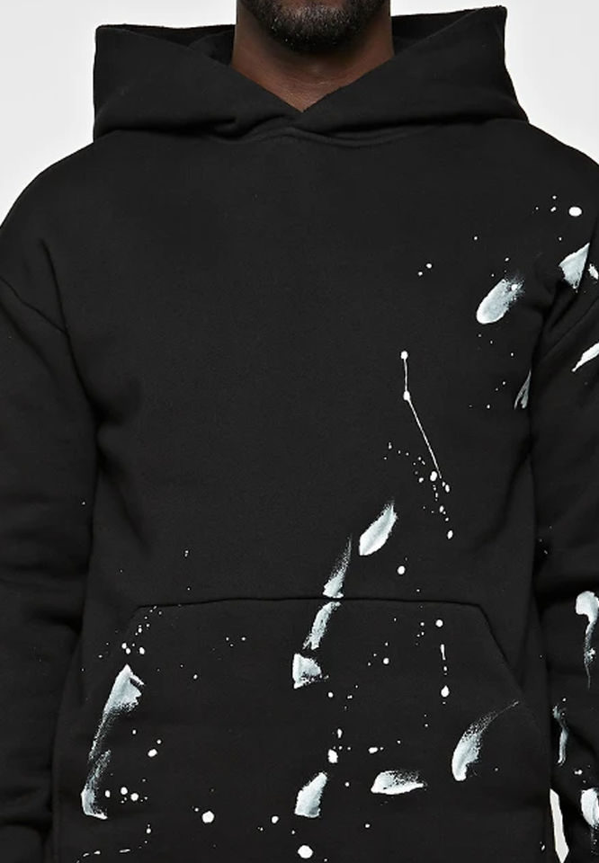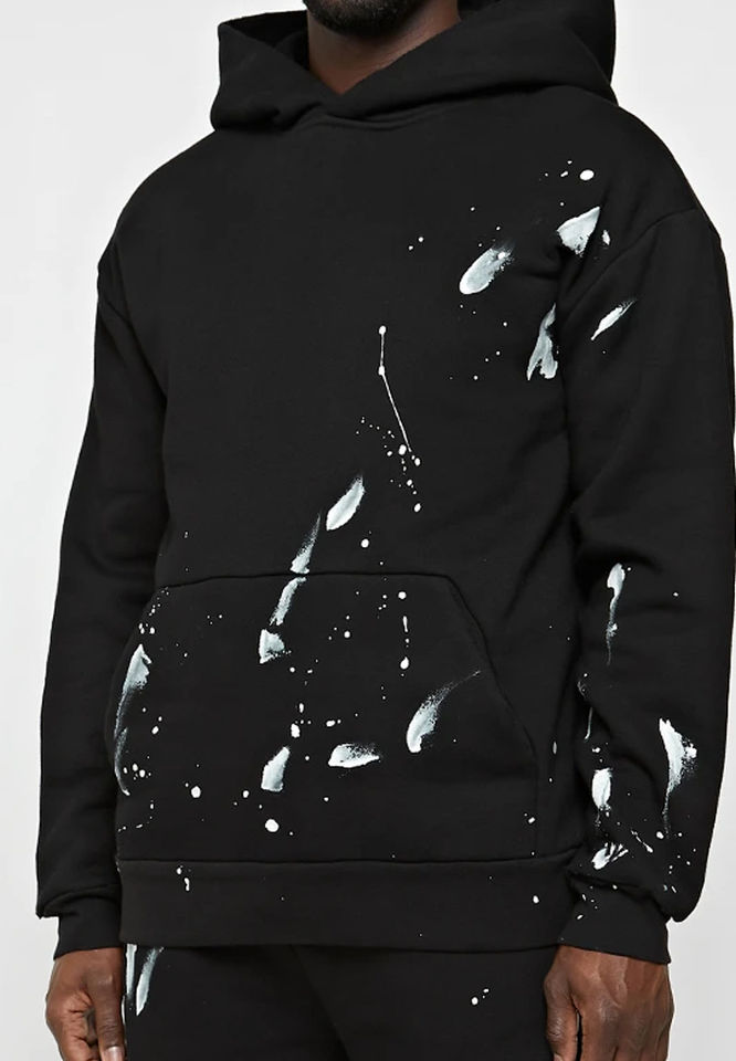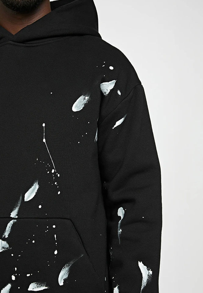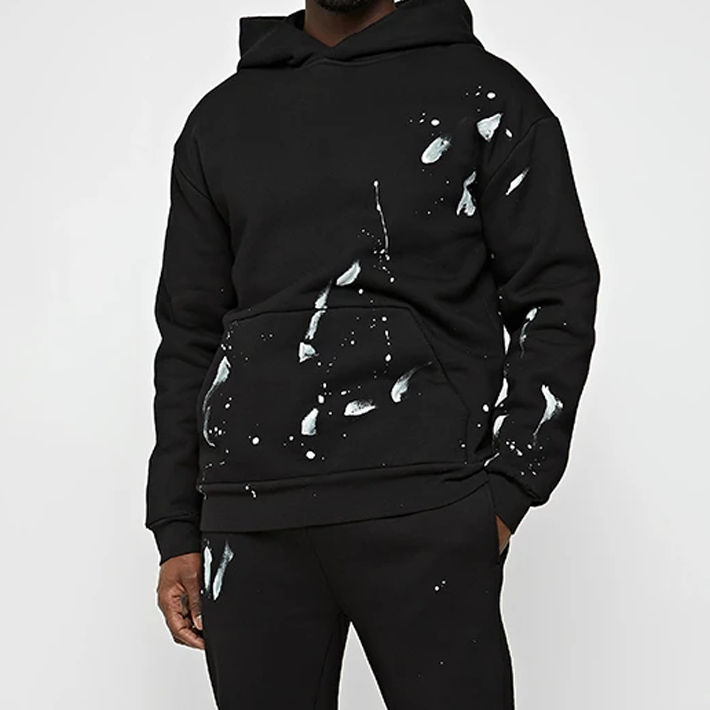 Chándales de invierno personalizados para hombre, de felpa negra desgastada, con efecto de salpicaduras de pintura, ecológicos, 100% algodón, chándal desgastado.