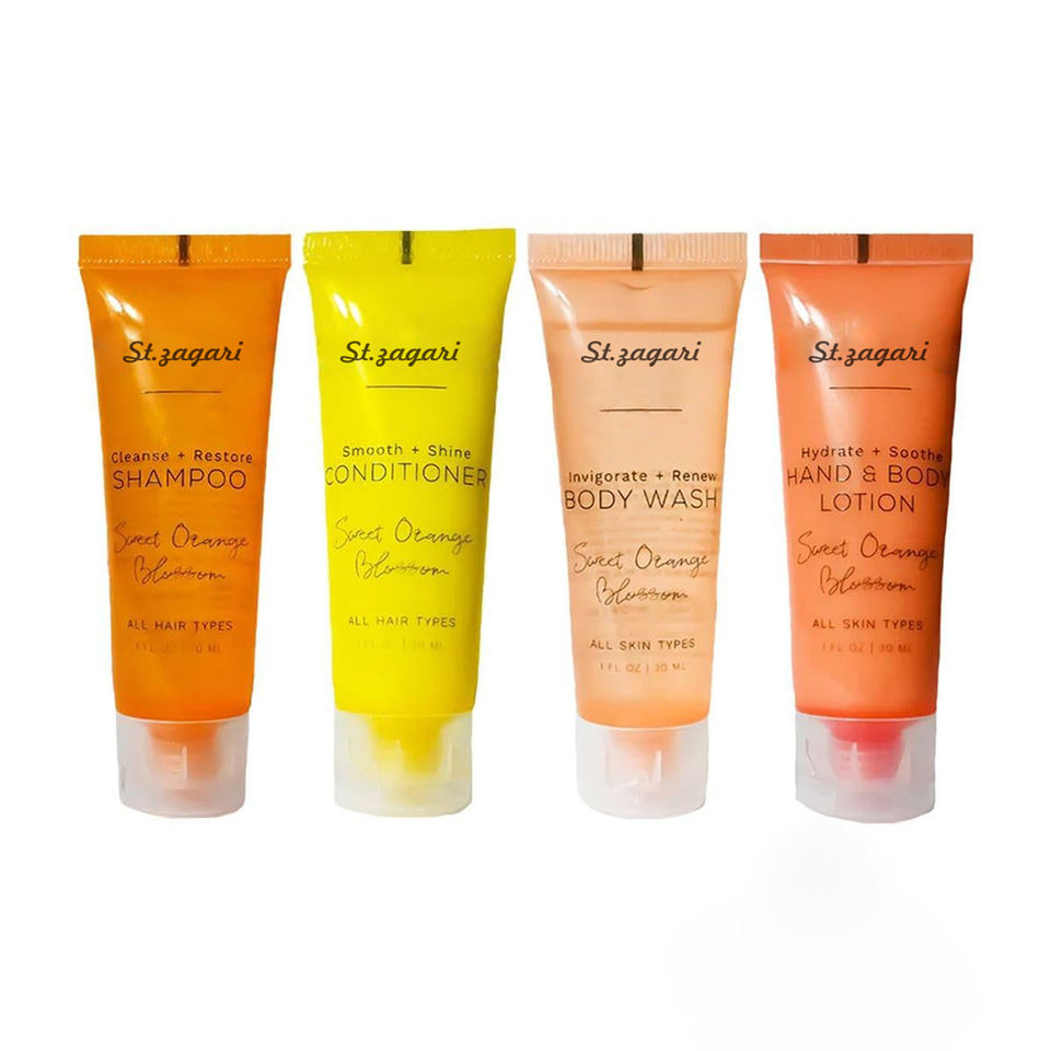 Set de Artículos de Tocador Ecológicos Personalizados para Mini Hoteles, Biodegradables y Reciclables, Champú, Gel de Ducha y Jabón en Tamaño de Viaje. Marca Privada Disponible.