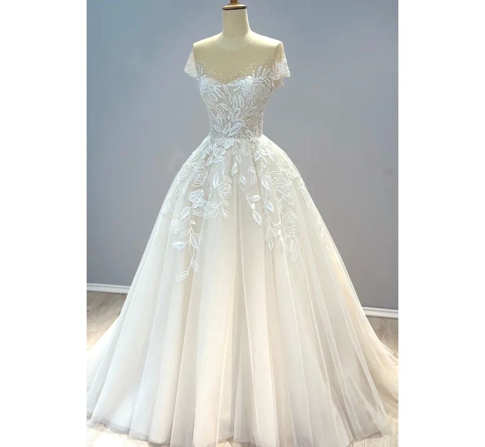 Vestido de novia de corte en A floral moderno personalizado hecho a mano TNBPno25 de talla grande con encaje de flores y cuentas hasta el suelo para el verano