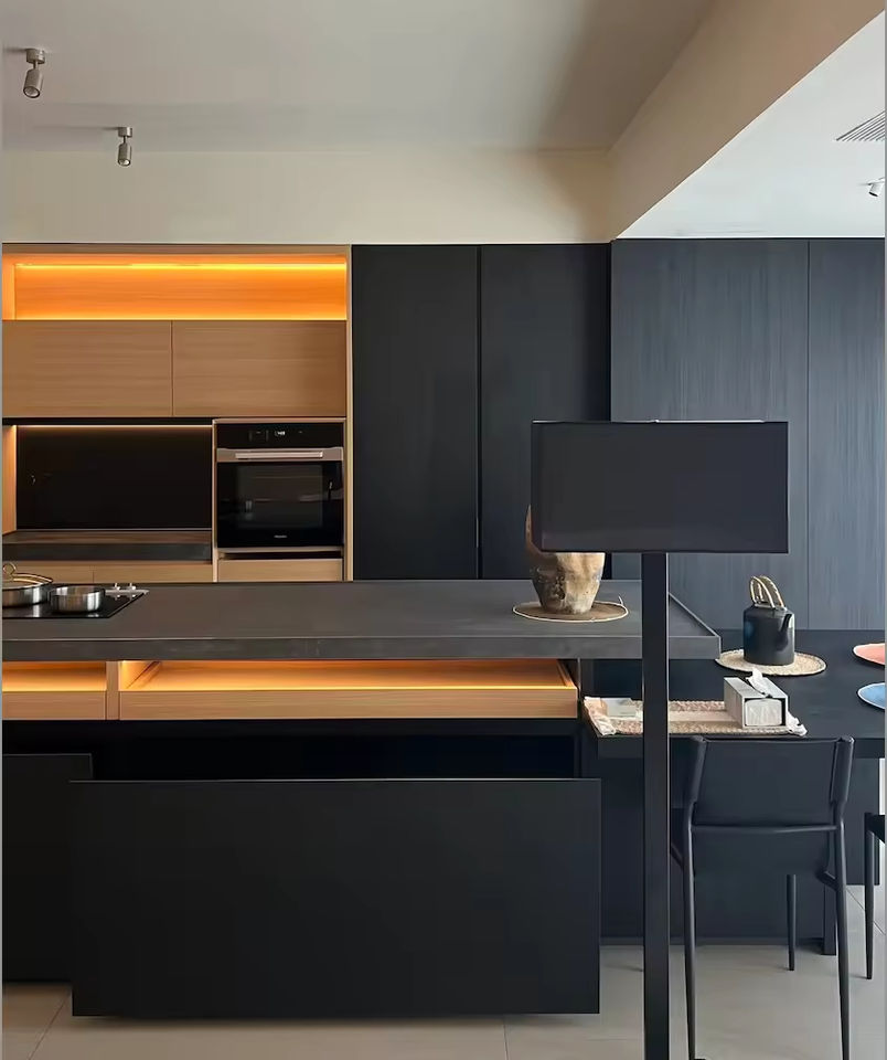 Gabinetes de Cocina Modernos de Lujo Personalizados con Isla, Detalles LED, Muebles de Madera Sólida, Espacio de Cocina Premium para el Hogar