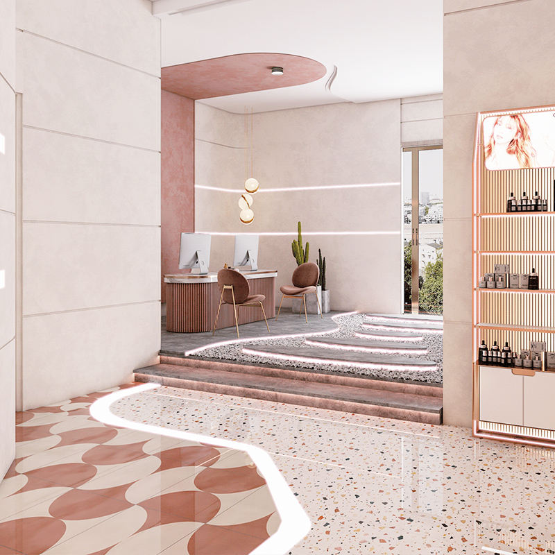 Mobiliario de Salón con Diseño Interior Elegante, Estación de Peluquería Profesional y Moderna en Color Rosa con Diseño Personalizado para Barbería