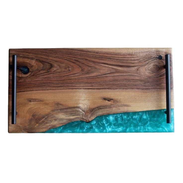 Bandeja de servicio de desayuno de comida de serpiente moderna personalizada, venta al por mayor de lujo, madera de acacia y resina azul con mango de Metal para bandeja de cocina