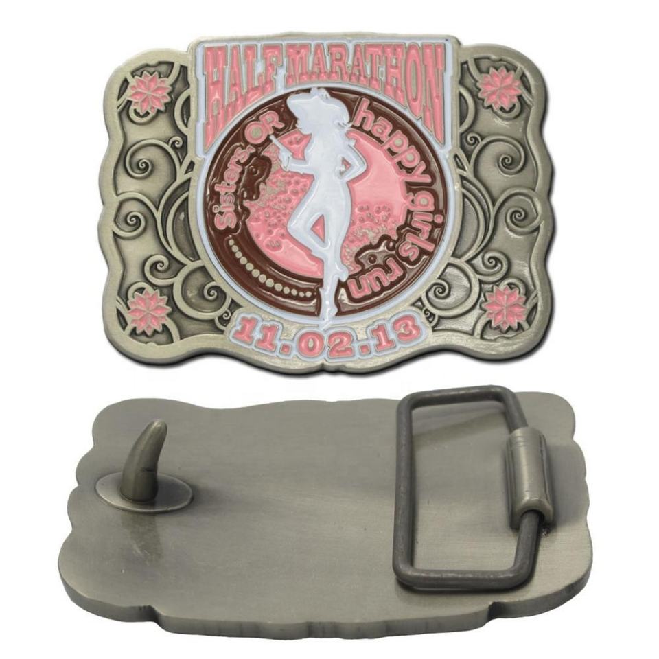 Hebilla de cinturón de metal antiguo personalizada, moderna, con serigrafía de esmalte suave, divertida, de moda, con diseño 'Sister Happy Girls Run' para mujer
