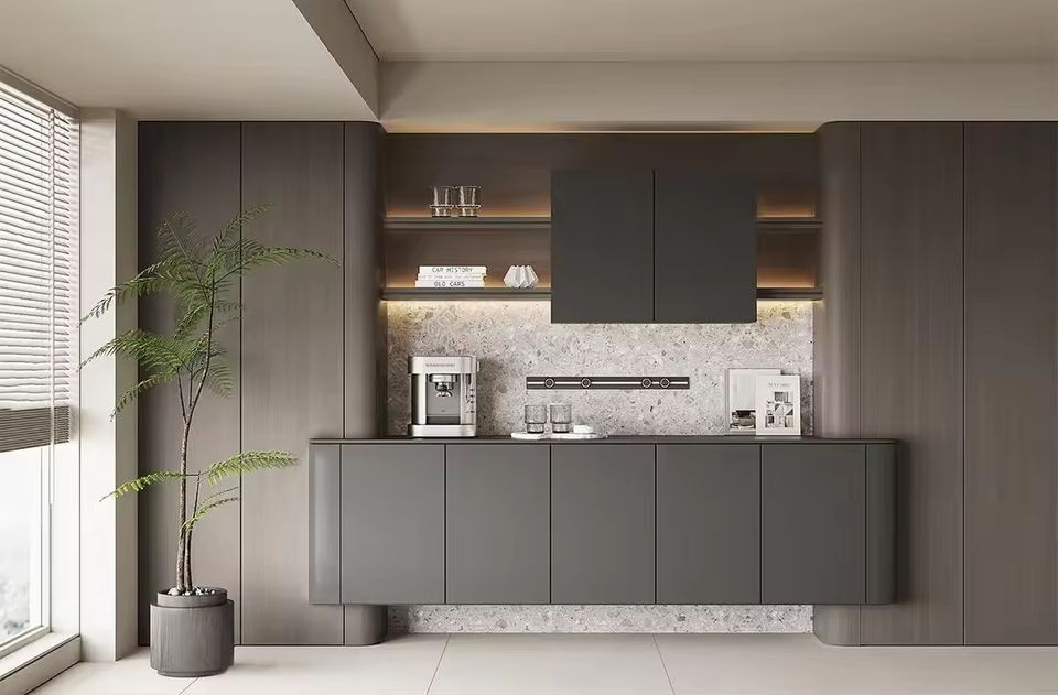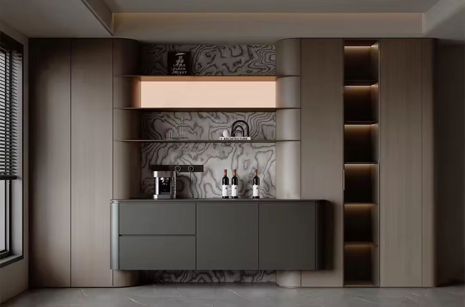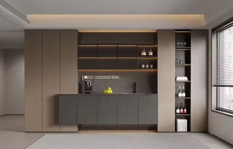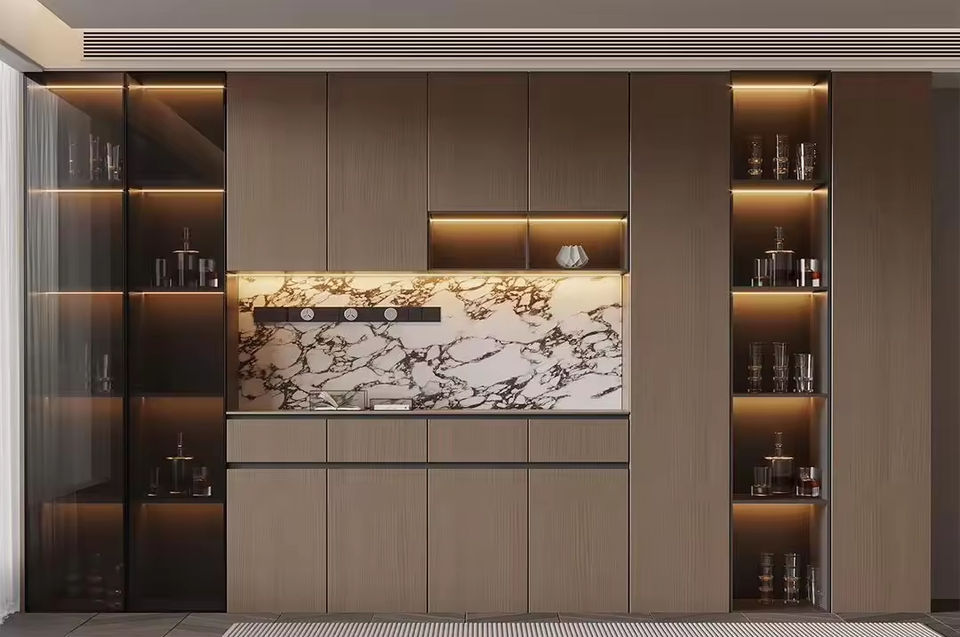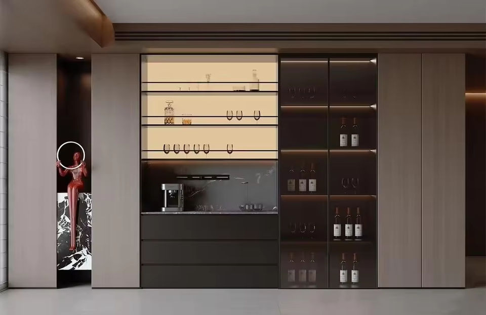 Mueble Bar Moderno y Elegante con Estantes Multi-Nivel y Almacenamiento Oculto para Sala de Estar o Comedor