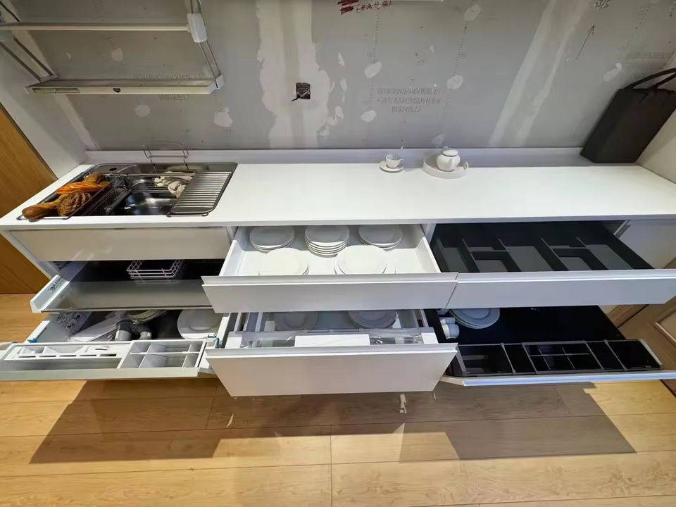 Gabinete de Cocina Blanco de Estilo Moderno Personalizado con Estantes Extraíbles, Herrajes de Almacenamiento Multifuncionales para Hogares Contemporáneos