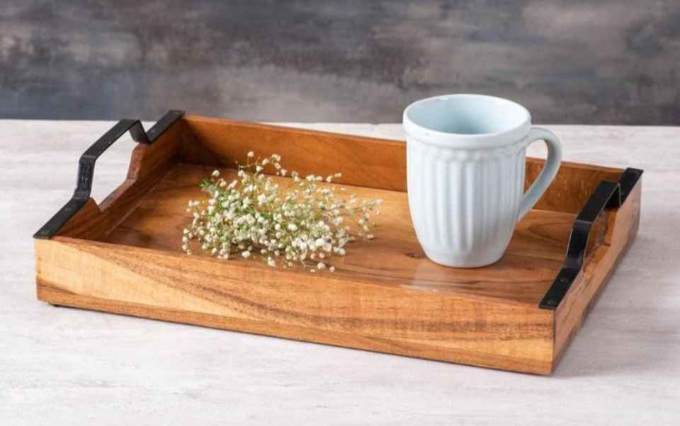Bandejas con incrustaciones de nácar, resina y hueso, bandeja de servir de madera con asa de metal, forma cuadrada, bandeja de madera con textura de corteza
