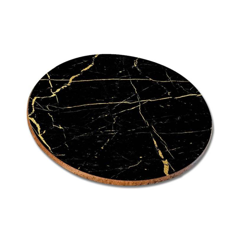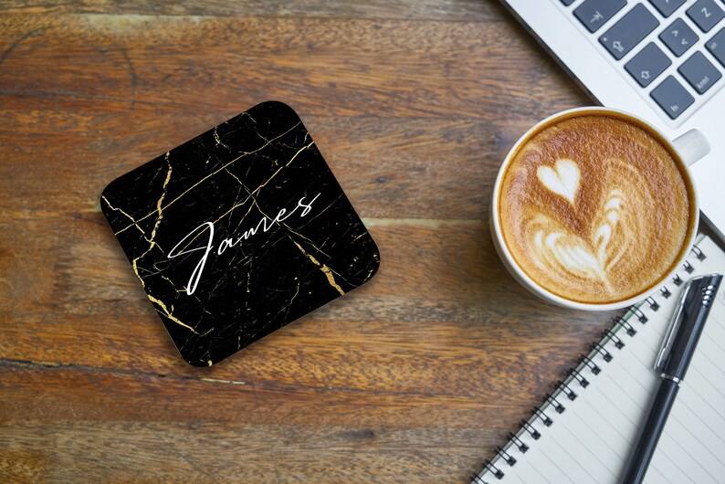 Posavasos Personalizados con Nombre, Posavasos Cuadrados y Redondos de Alto Brillo para Café, Estilo Mármol Negro