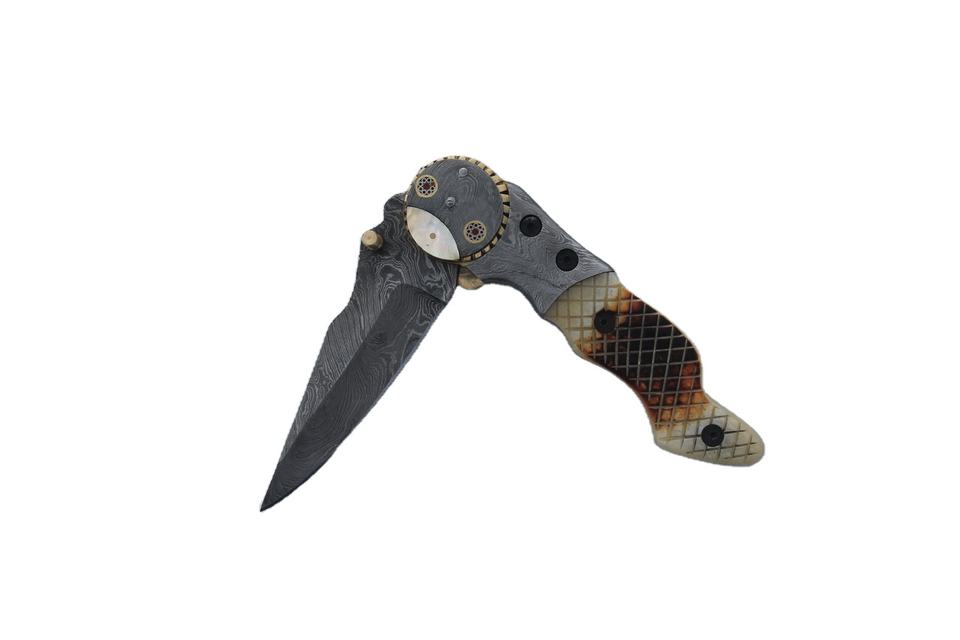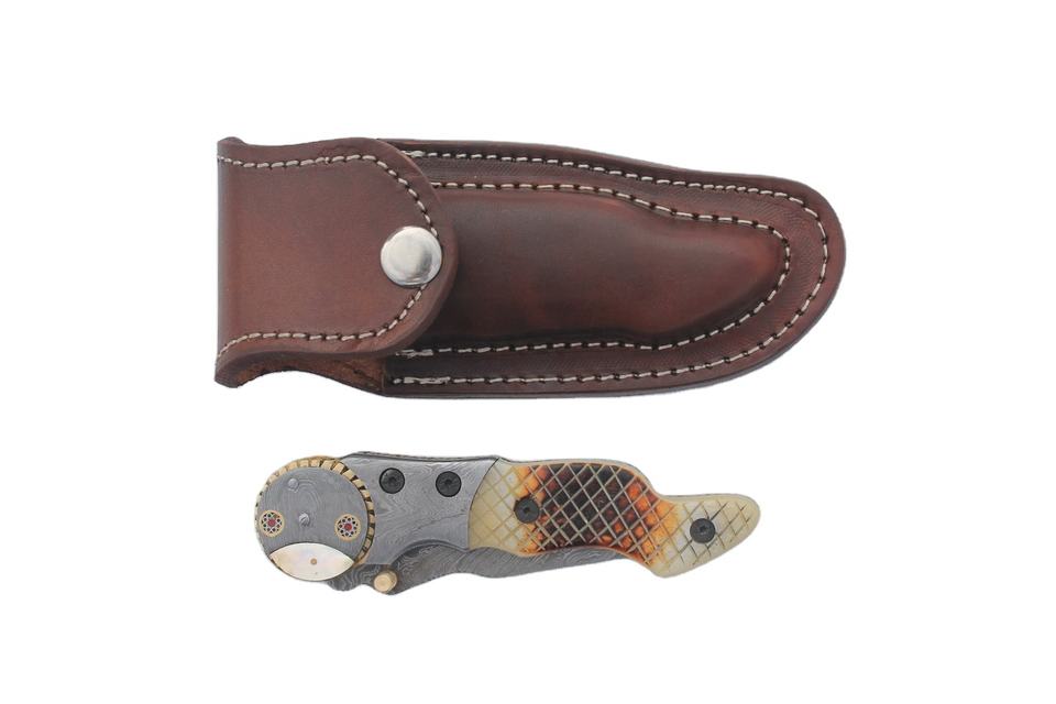 Hueso de camello, acero de Damasco, latón, resina químicaMaterial del mango