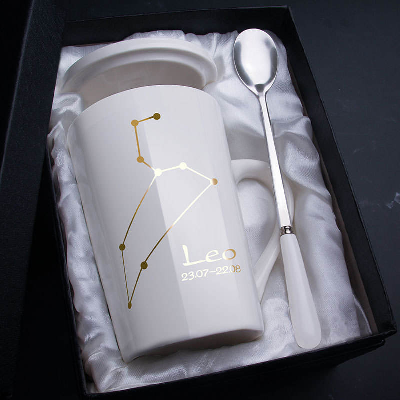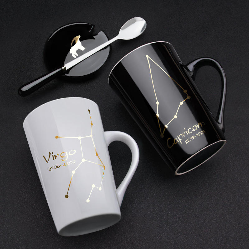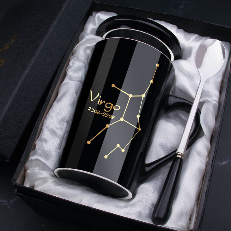 Taza de Café de Porcelana con Signo del Zodiaco, Regalo Personalizado, Taza de Cerámica de las 12 Constelaciones con Tapa y Cuchara