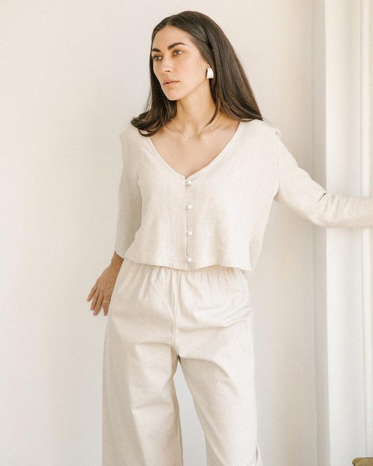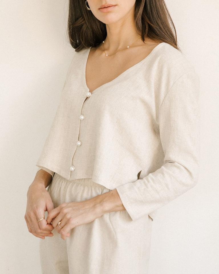 Conjunto de 2 Piezas de Lino Natural Transpirable con Estampado Floral Vintage para Mujer, Diseño Personalizado ODM, Elegante, Manga Larga, con Botones, Resistente a las Arrugas