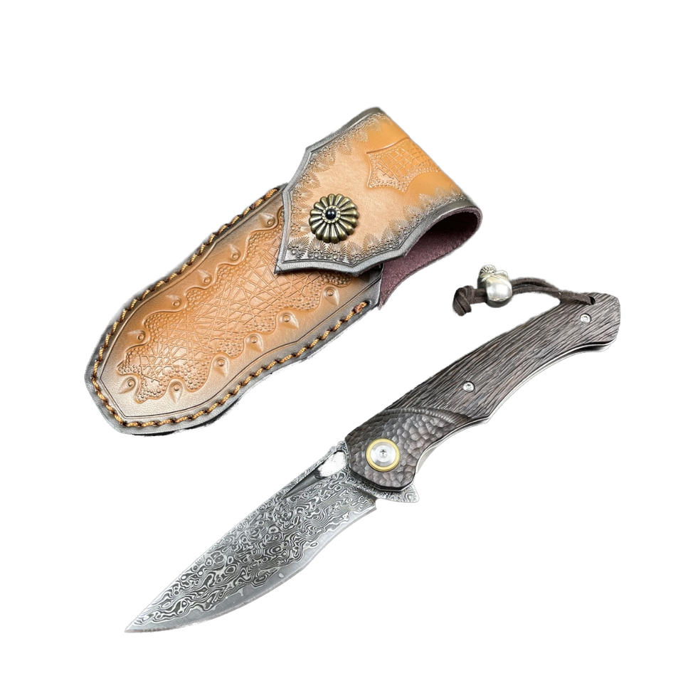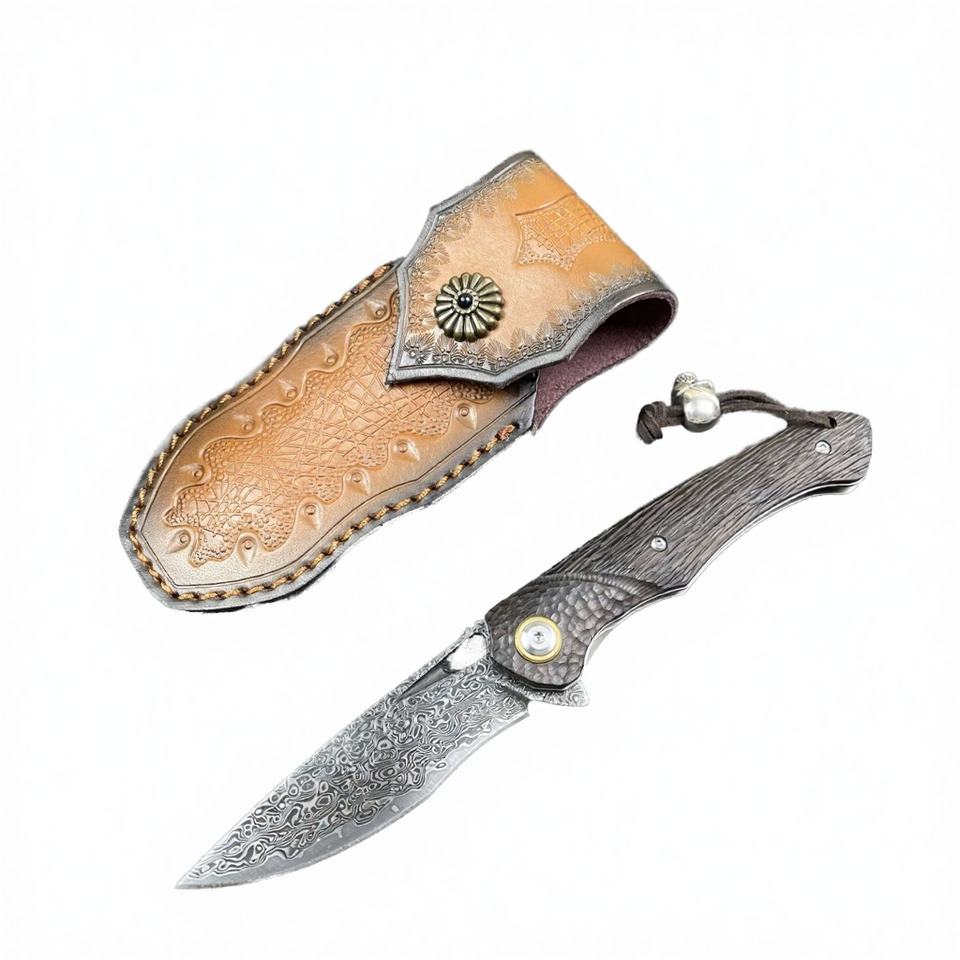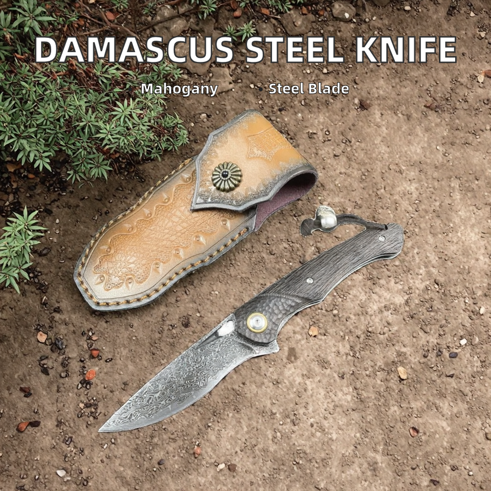 Cuchillo de Bolsillo Plegable Personalizado OEM de Acero de Damasco con Mango de Caoba Roja, Herramienta EDC para Campismo y Supervivencia al Aire Libre