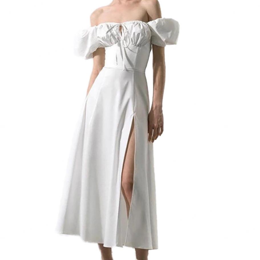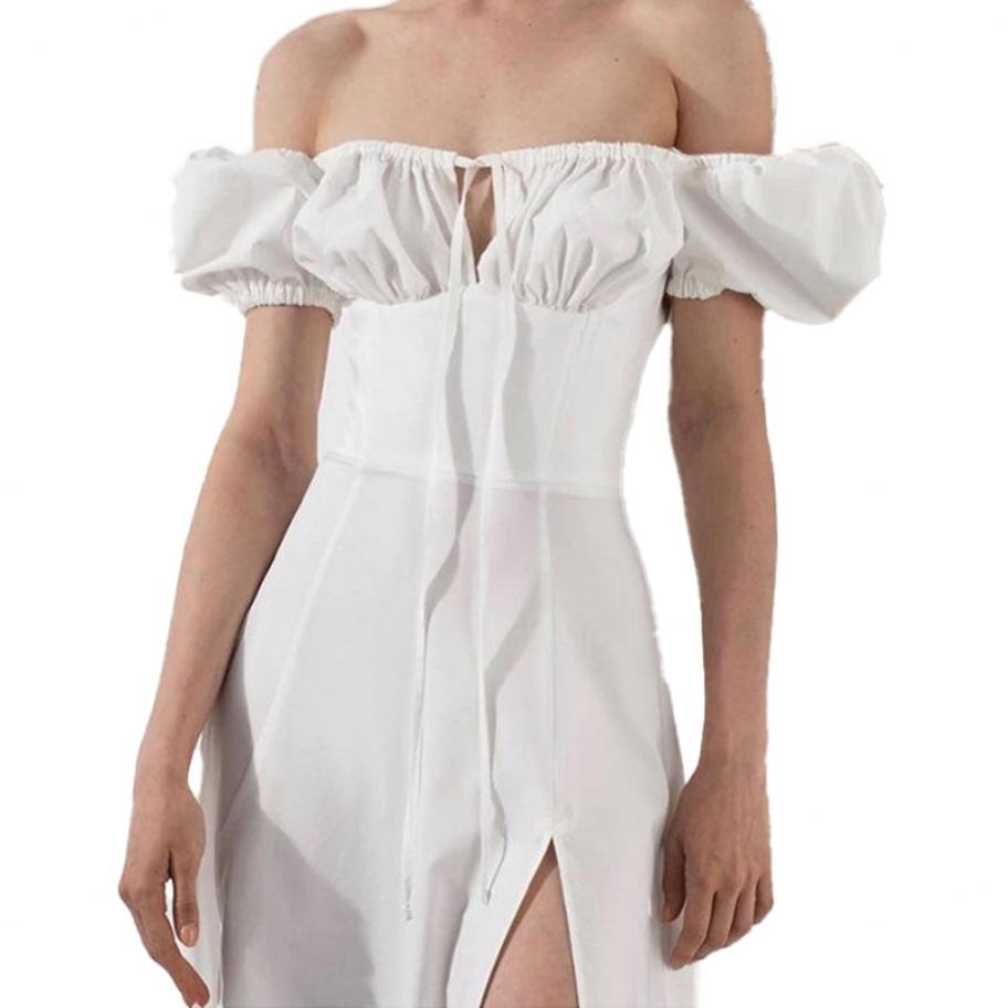 Vestido Midi Francés Personalizado OEM de Alta Calidad para Primavera/Verano, con Hombros Descubiertos, Ajuste Delgado, Sin Mangas, con Abertura de Encaje y Cintura Natural, Ideal para el Día a Día