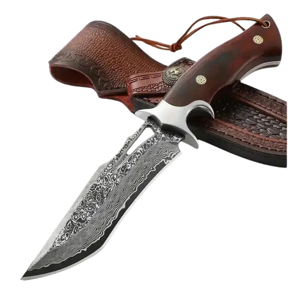 Cuchillo de caza personalizado OEM/ODM de 10 pulgadas, forjado a mano en Damasco, con hoja de punta de clip, mango de madera y funda de cuero (Grado DIY)