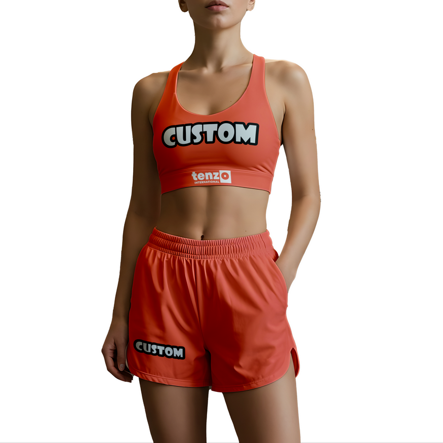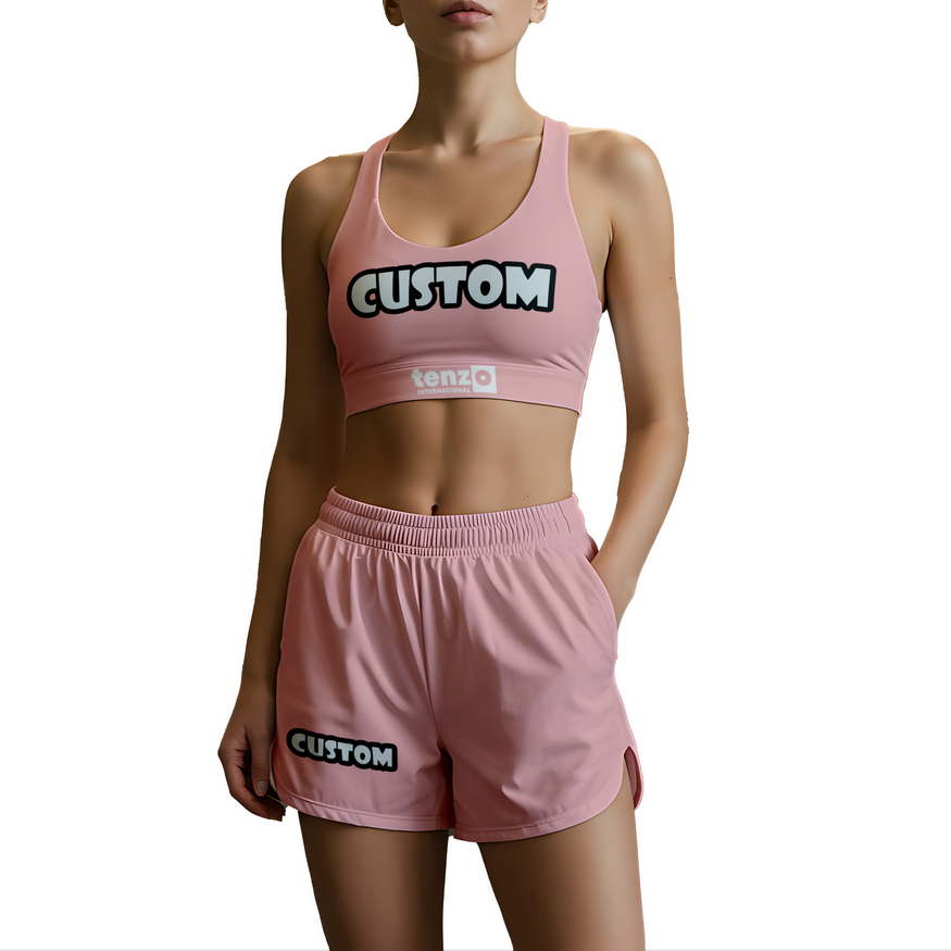 Conjunto de ropa deportiva de 2 piezas con logotipo frontal sólido OEM/ODM personalizado para mujer, ropa de gimnasio de LICRA de poliéster transpirable con camiseta sin mangas y pantalones cortos