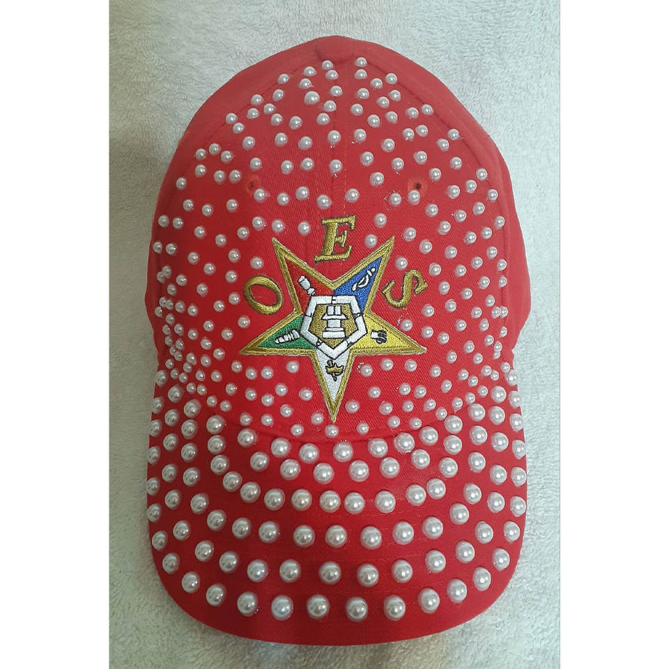 Gorra de béisbol roja OES personalizada con tachuelas de perlas y emblema de estrella bordado