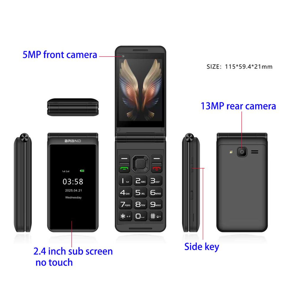 Característica:Doble tarjeta SIM, Flip teléfono con whatsapp, 4G Flip teléfono Android OS, Teléfono del tirón 4g para los mayores, Teléfono dual del tirón de la pantalla, Pantalla táctil Flip teléfono Android