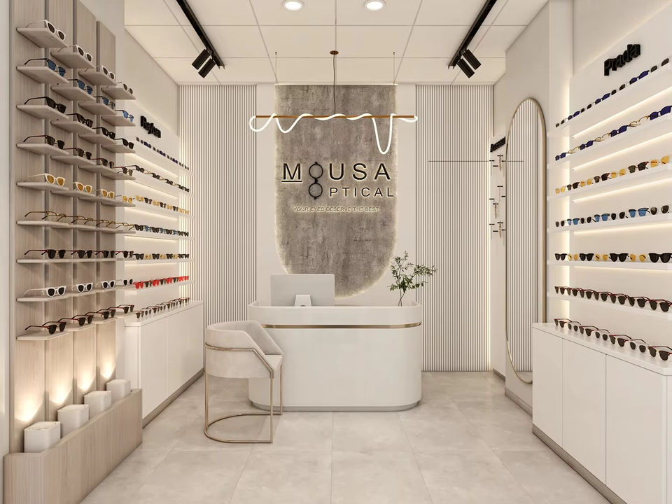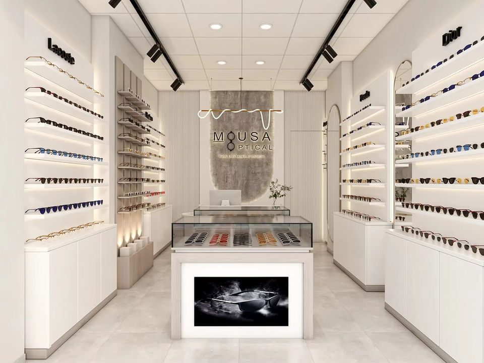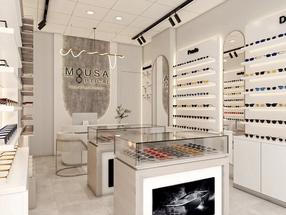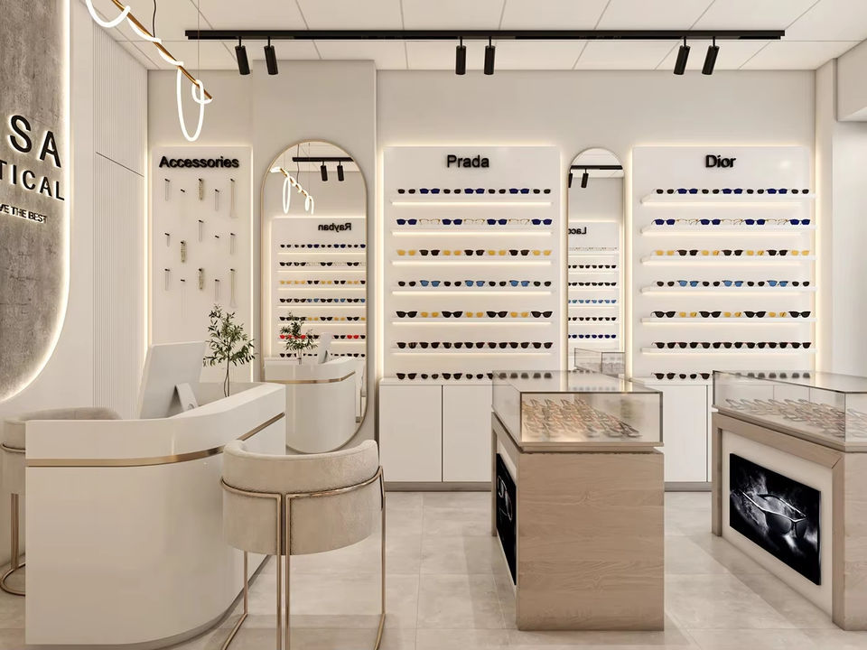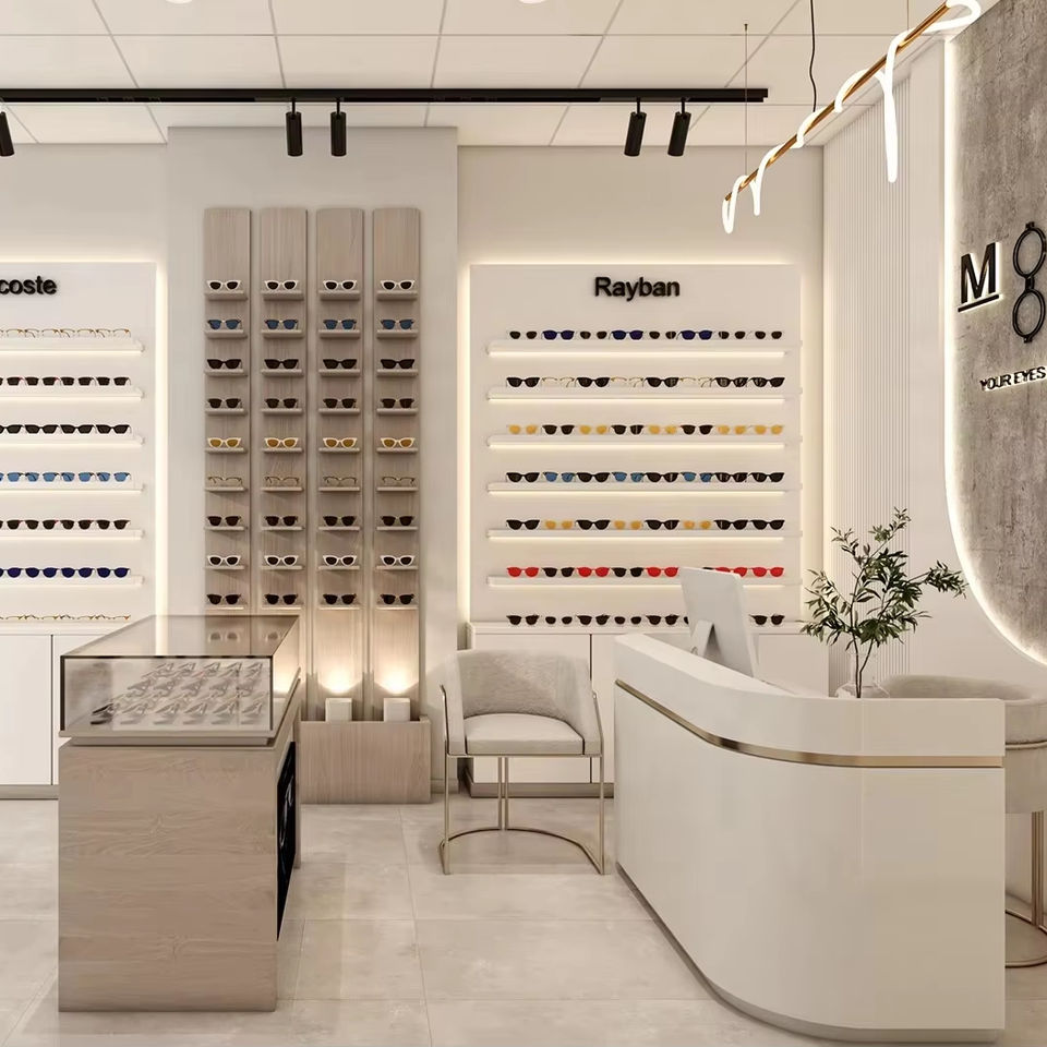 Exhibidor Personalizado para Óptica | Muebles Modernos para Tiendas de Gafas y Estante de Pared de Madera para Gafas de Sol