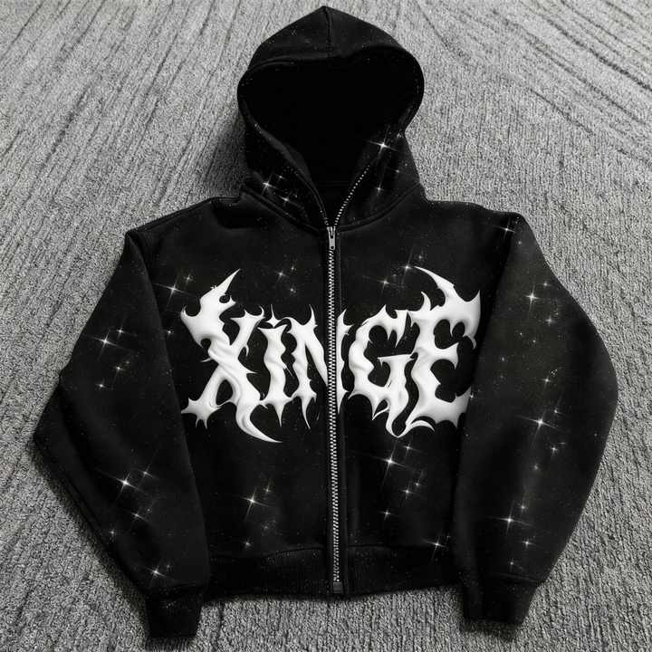 Sudadera con capucha extragrande de diseño gótico original personalizado con logo, estilo urbano, estampado de pedrería, hombros caídos, corte holgado, con cremallera para hombre