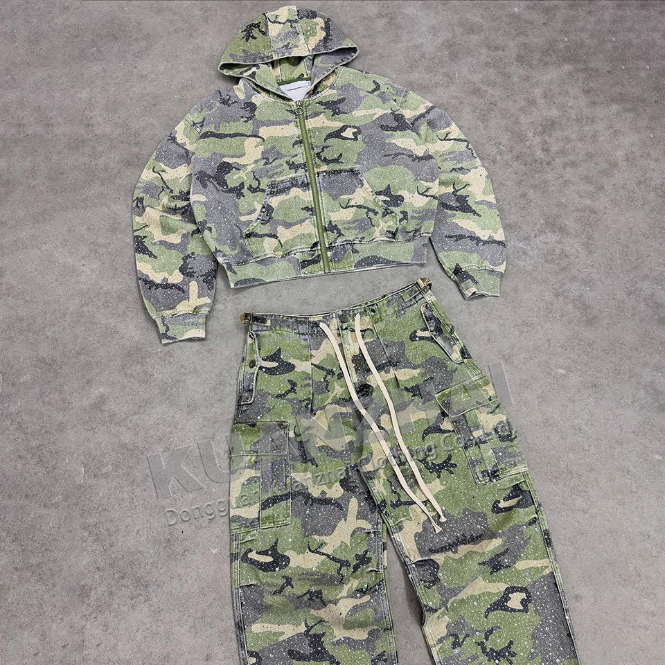 Personalizado de gran tamaño camoflouge sudadera fabricante CAMO pantalones cargo y cremallera sudaderas con capucha chaqueta conjunto holgado streetwear chándal hombres