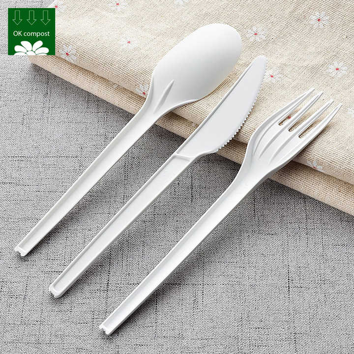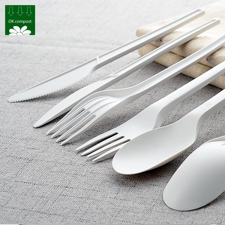Cubiertos personalizables de PLA, utensilios de cocina respetuosos con el medio ambiente, vajilla desechable Biodegradable, tenedor y cuchara con juego