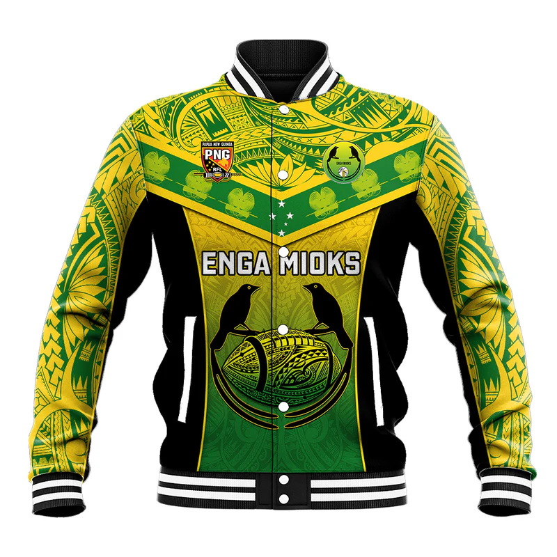 Personalizado Papua Nueva Guinea Rugby Chaqueta de béisbol Enga Mioks PNG Polinesio Botón completo Bomber Béisbol Tallas grandes Chaquetas de los hombres