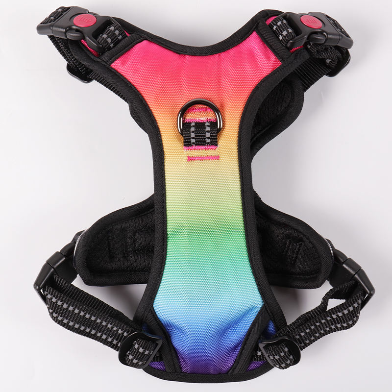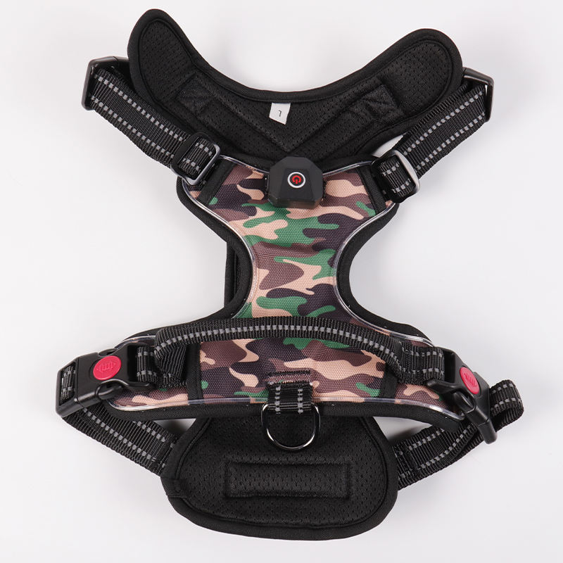 Patrón personalizado Oxford al aire libre Night Walking Mesh Clip frontal SIN tirar Arnés para perros con luces LED USB recargables RGB