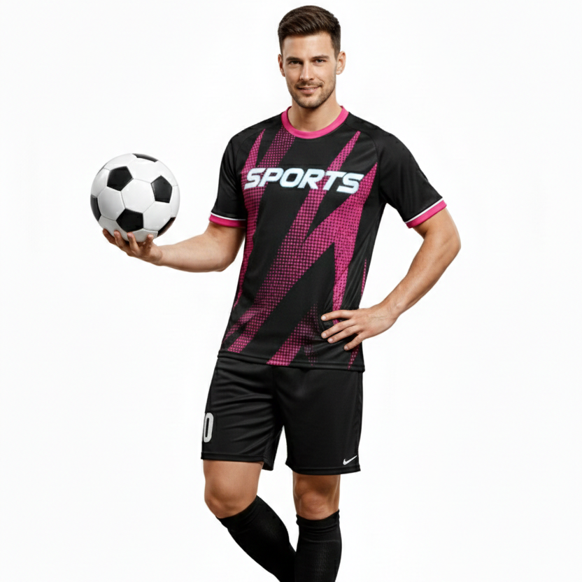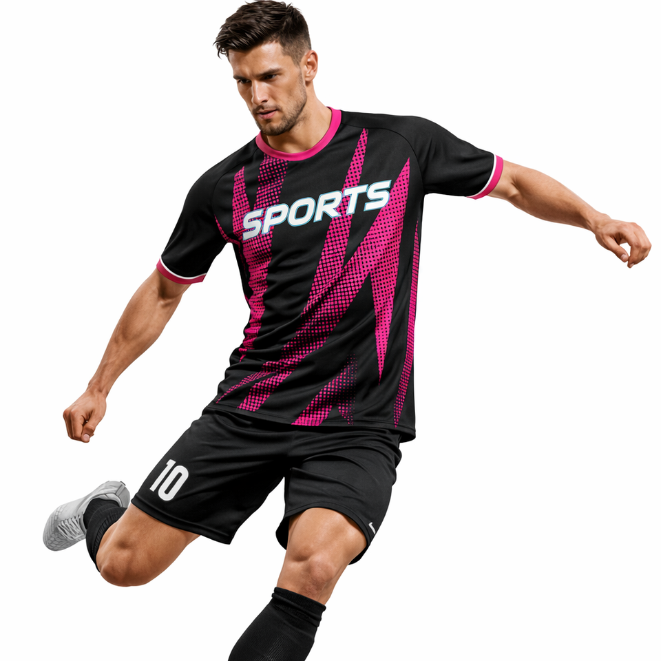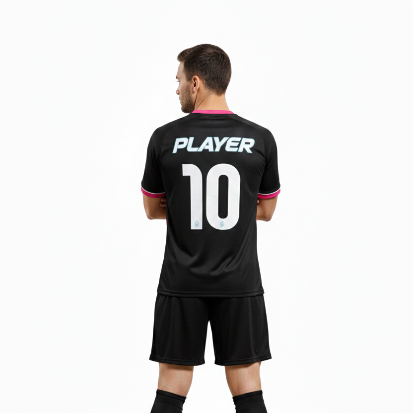 Uniforme de Fútbol de Invierno con Diseño Personalizado, Conjunto de Camiseta y Pantalones Cortos con Logotipo Frontal en Negro y Rosa, Calidad Premium