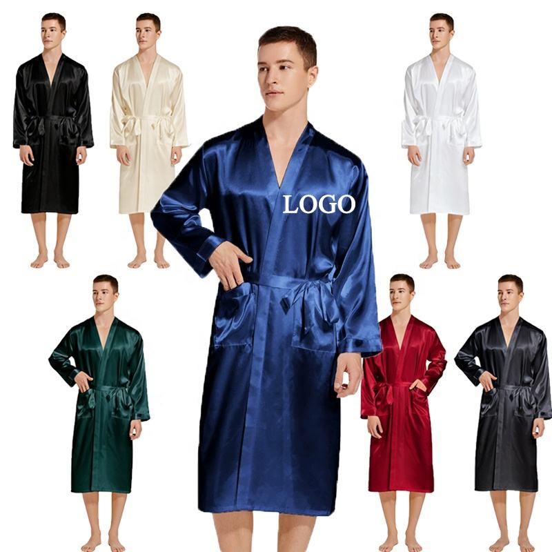 Batas de satén lisas y sexys de talla grande personalizadas, kimono largo, ropa de dormir, camisón, ropa de dormir para hombre, albornoz para hombre