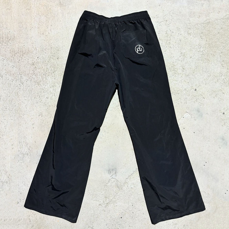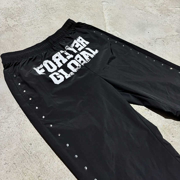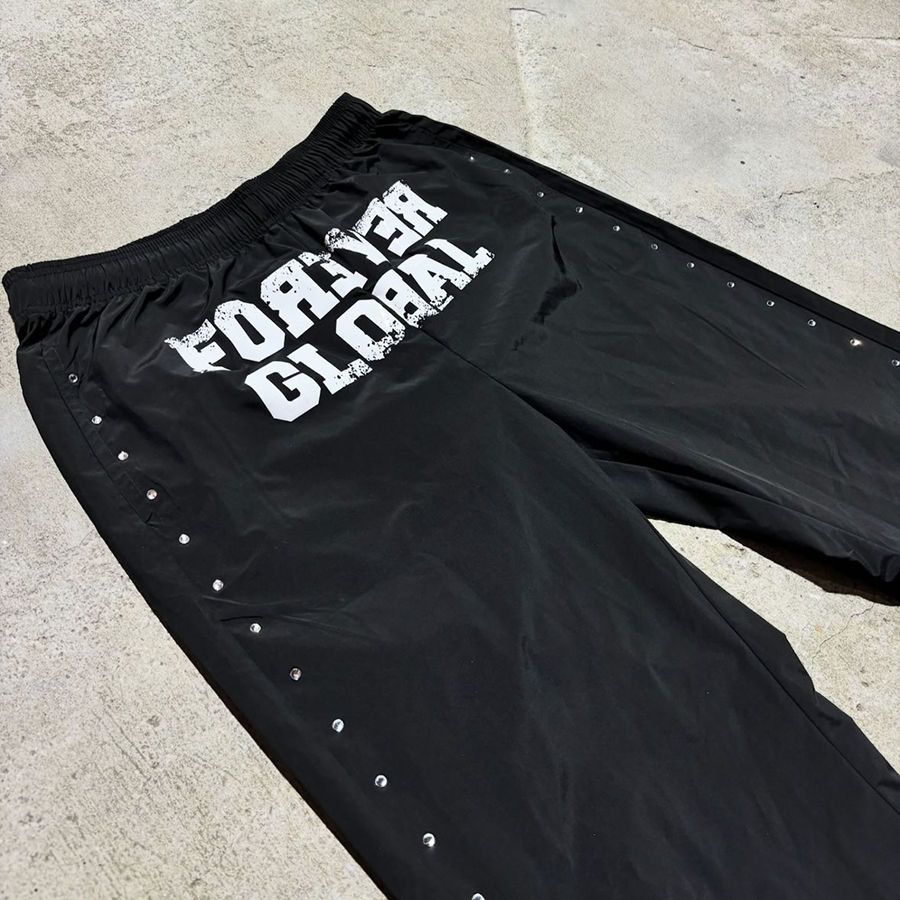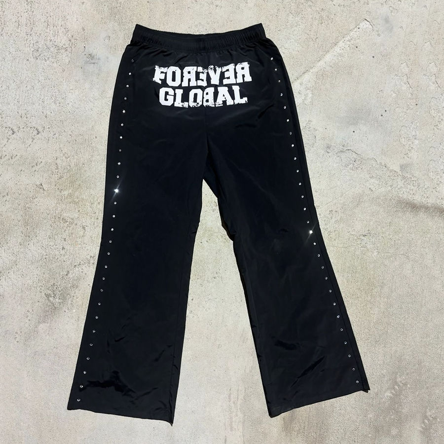 Pantalones de chándal de pierna ancha con diamantes de imitación de gran tamaño de poliéster personalizado, ropa de calle con serigrafía de letras, pantalones de chándal acampanados holgados de nailon para hombre