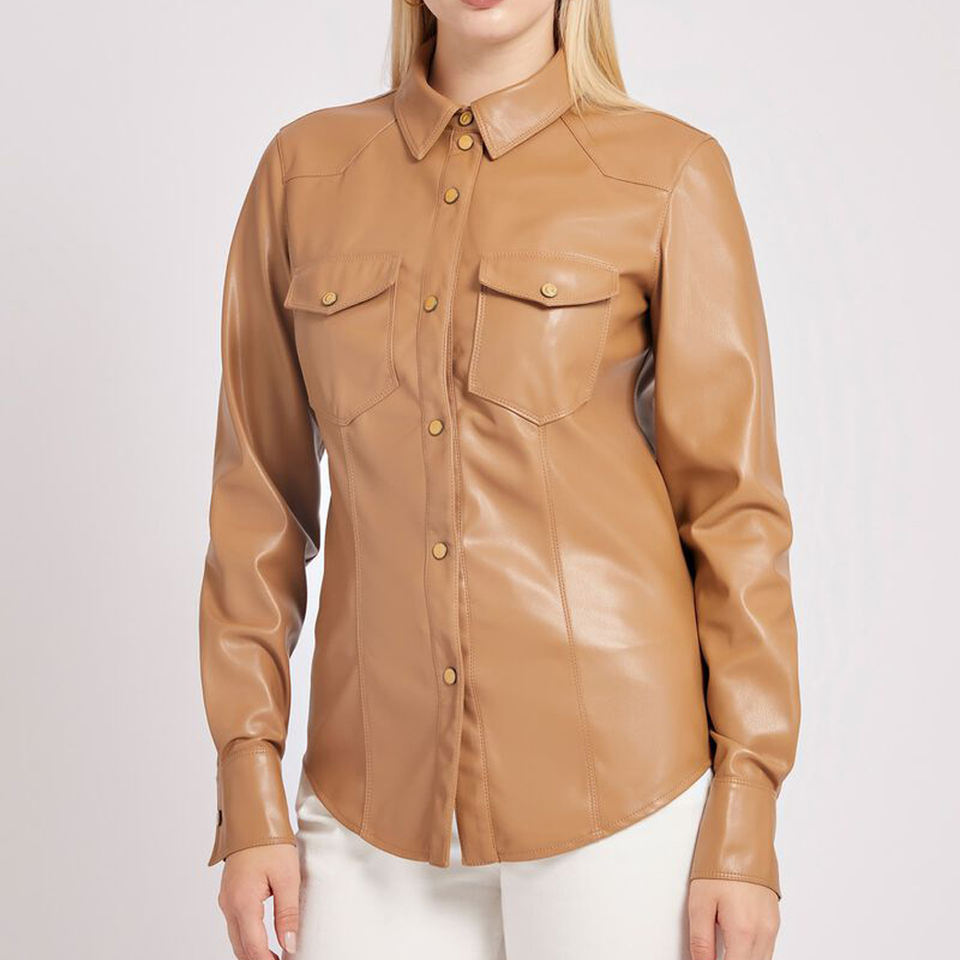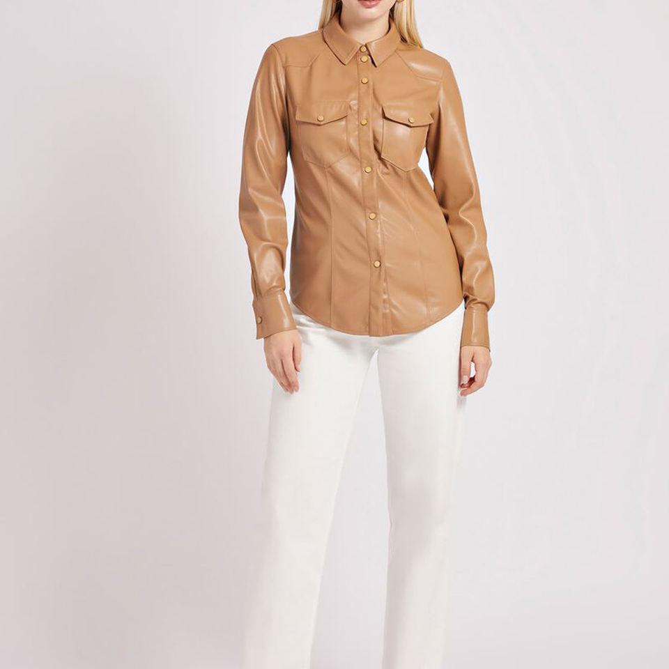 Personalizado Popular de alta calidad Color sólido camisa de cuero bordado Cuello clásico manga larga ajuste relajado botones otoño