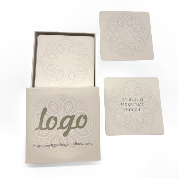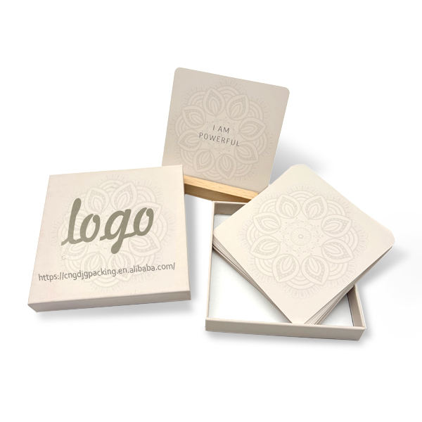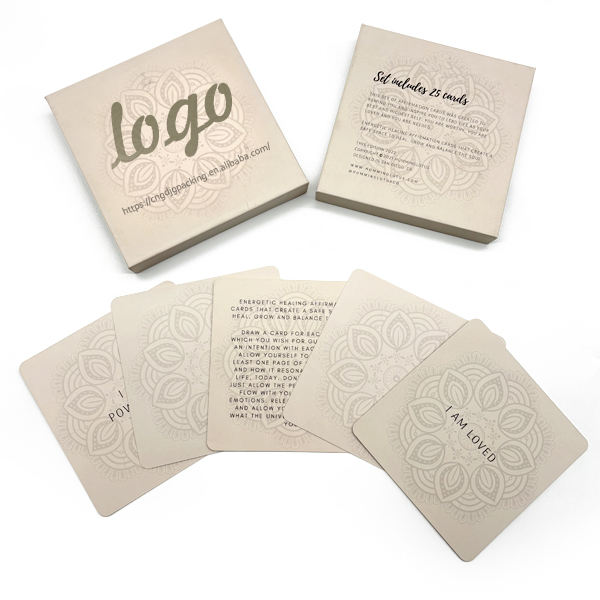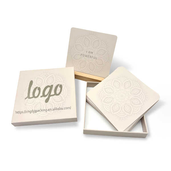 Tarjetas de afirmación de impresión en color claro con base de flores de relajación y autofrases positivas personalizadas con caja y soporte de escritorio de bloque de madera