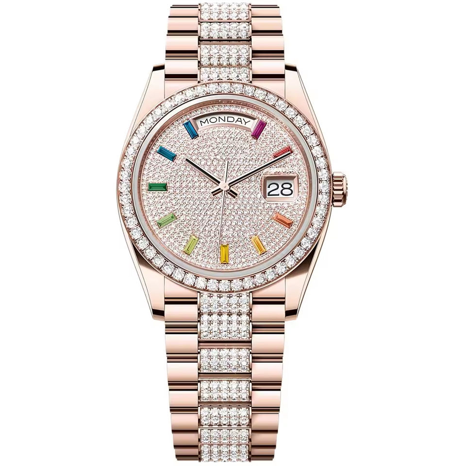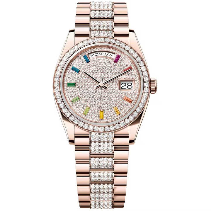 Reloj Mecánico Automático Personalizado con Correa de Cuero, Cristal de Zafiro y Esfera con Diamantes de Laboratorio y Mossanita en Oro Rosa