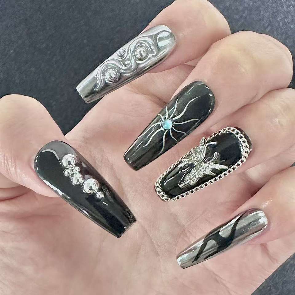 Uñas Postizas Personalizadas Negras con Accesorios, Estilo Stiletto, Decoración en Relieve 3D, de Lujo para Chicas, para Festivales, Venta al Por Mayor