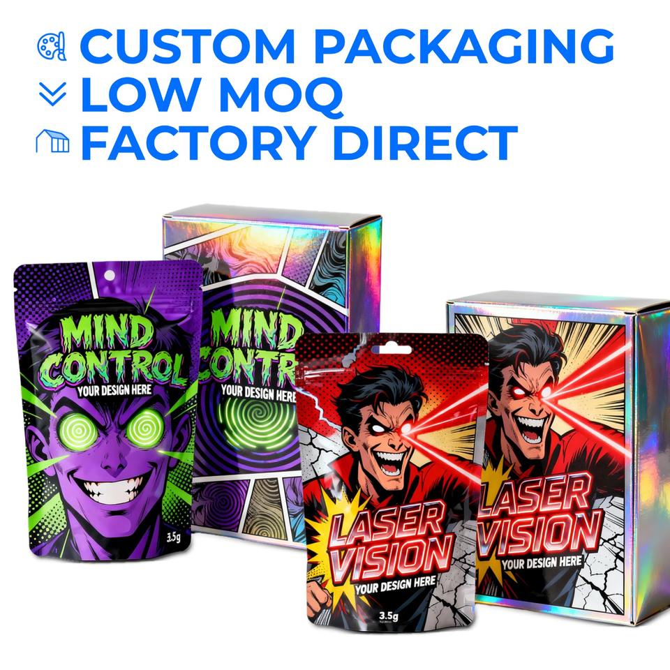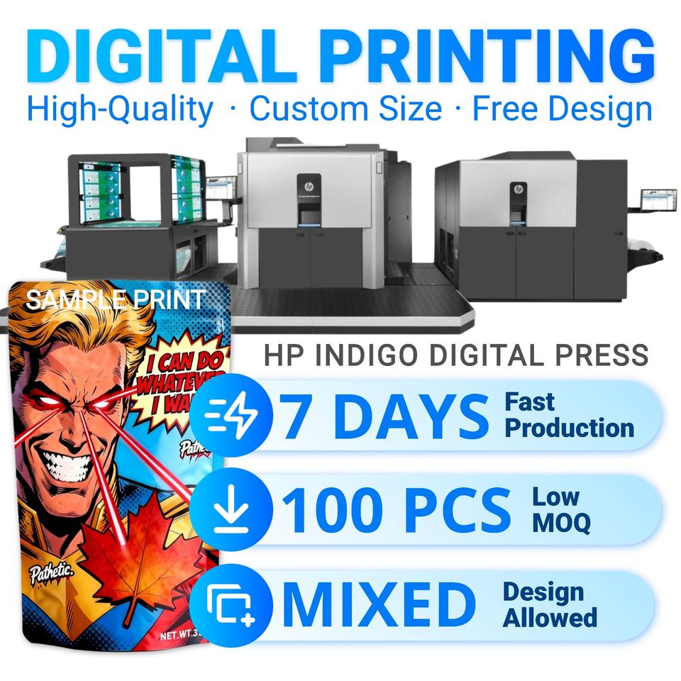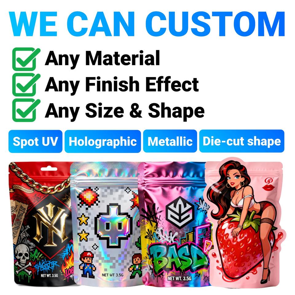 Juego de bolsas de Mylar resellables con impresión personalizada, 3,5g, 7g, 1lb, 14g, 28G, caja de bolsas con cremallera para dulces Cali a prueba de olores con forma especial para leche
