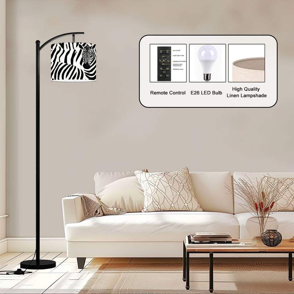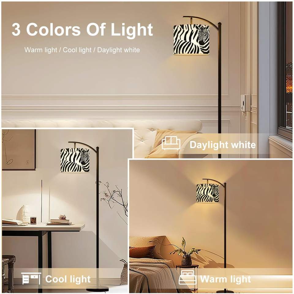 Impresión personalizada bajo demanda Lámpara de pie de arco Cebra Raya Negro Blanco Africano Remoto Regulable Tambor Sombra Pedal Lámpara alta MOQ 1