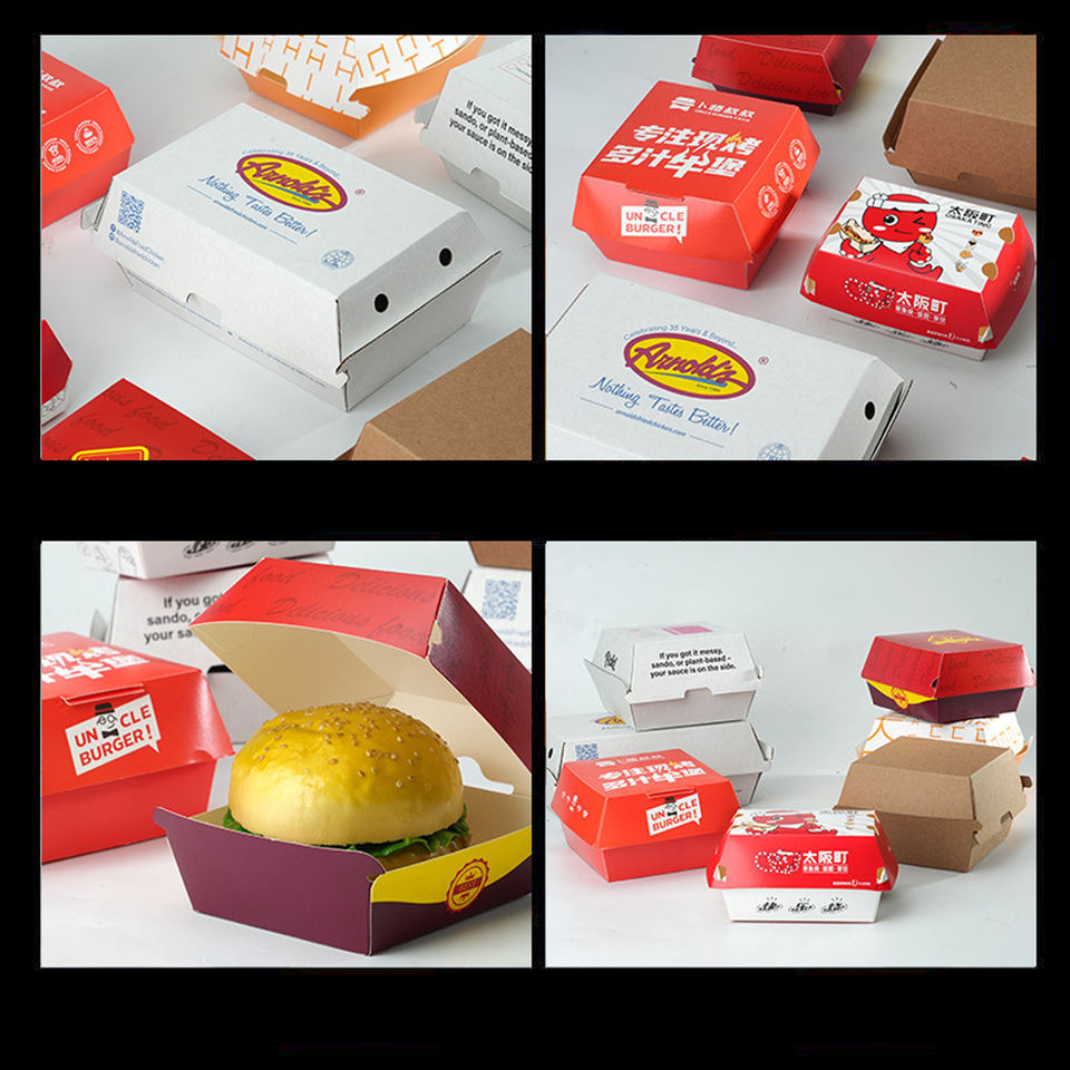 Cajas de Hamburguesas Corrugadas Impresas Personalizadas para Comida Rápida para Llevar, Resistentes a la Grasa, Desechables