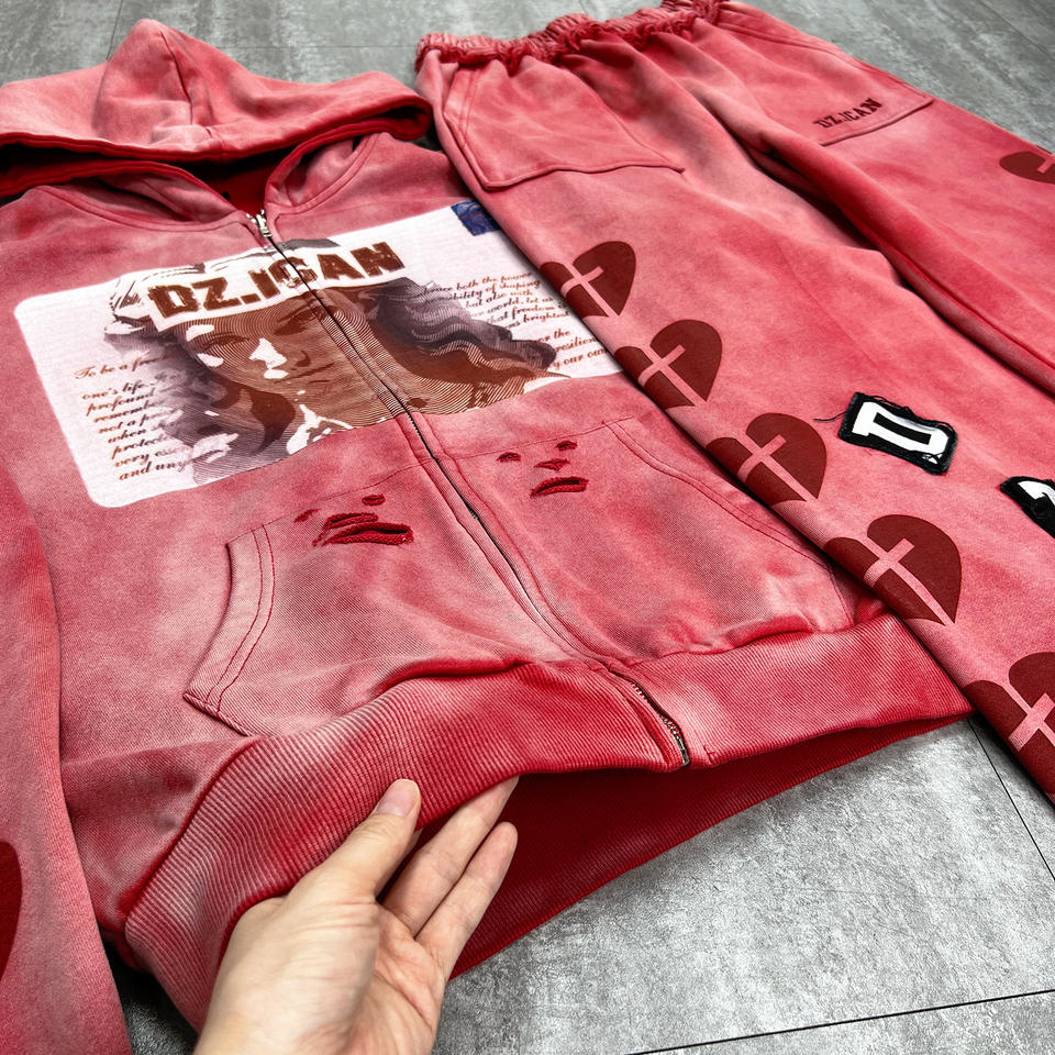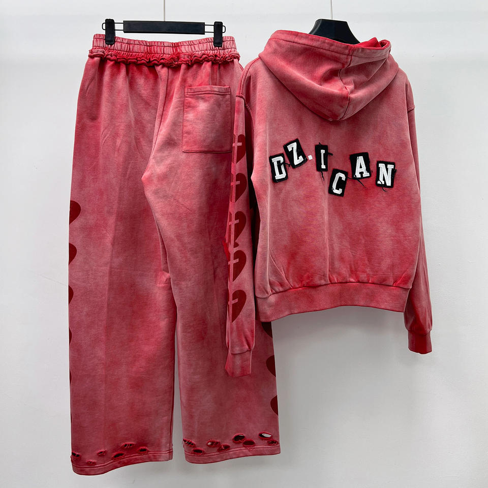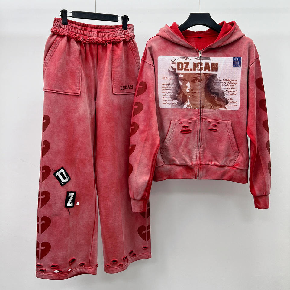 Conjunto de Sudadera y Pantalones Deportivos de Felpa Francesa con Estampado Personalizado, Estilo Vintage, Lavado Ácido, Corte Holgado para Hombre