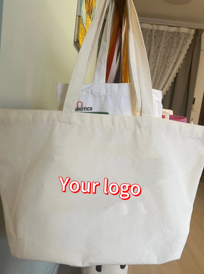 Bolsa de Compras de Lona Grande Blanca Personalizada con Estampado, Bolsillo con Cierre de Cremallera, Asas de Polipropileno