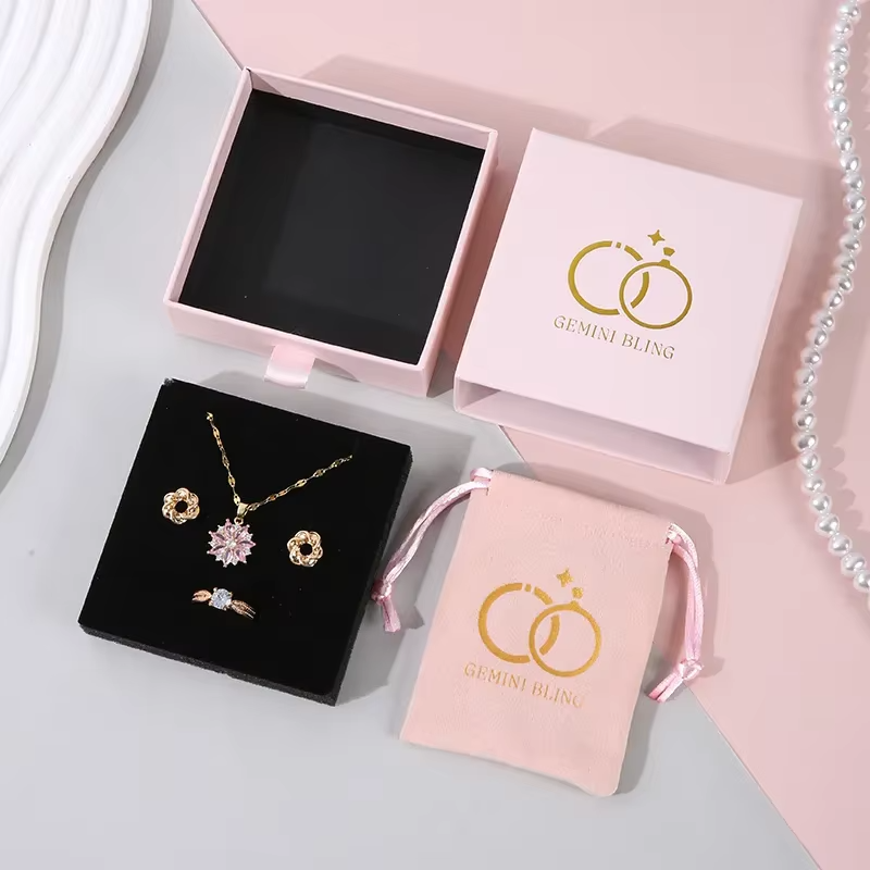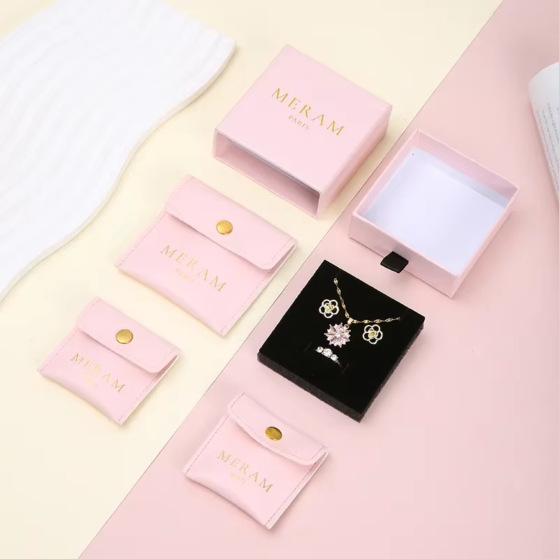 Joyero cuadrado moderno impreso personalizado logotipo personalizado cierre a presión cajón cartón embalaje microfibra joyería bolsa