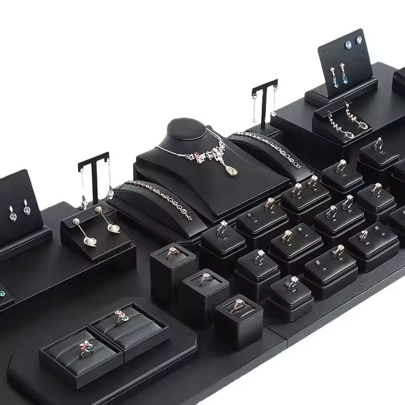 Expositor de Joyería Personalizado para Tienda: Set de Bases para Collares, Bustos de Gamuza Negra y Soportes de Anillos y Pulseras de Cuero PU