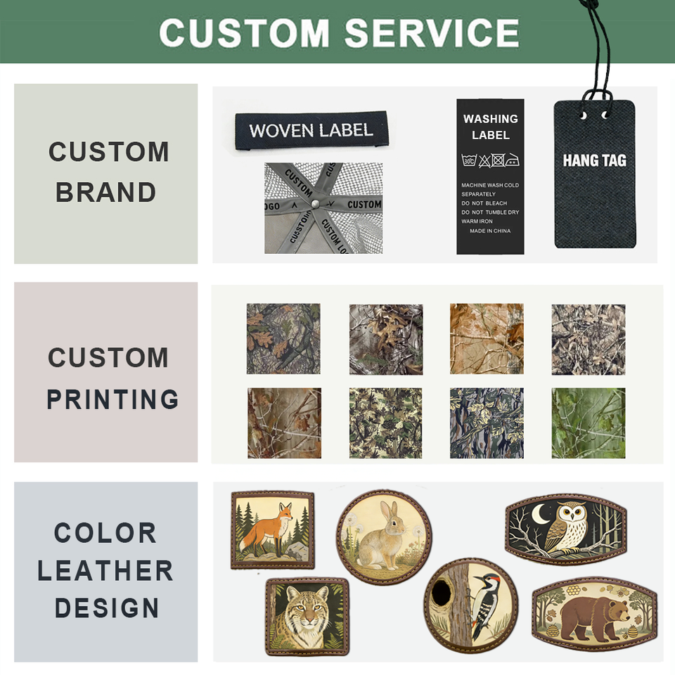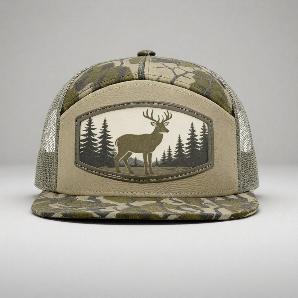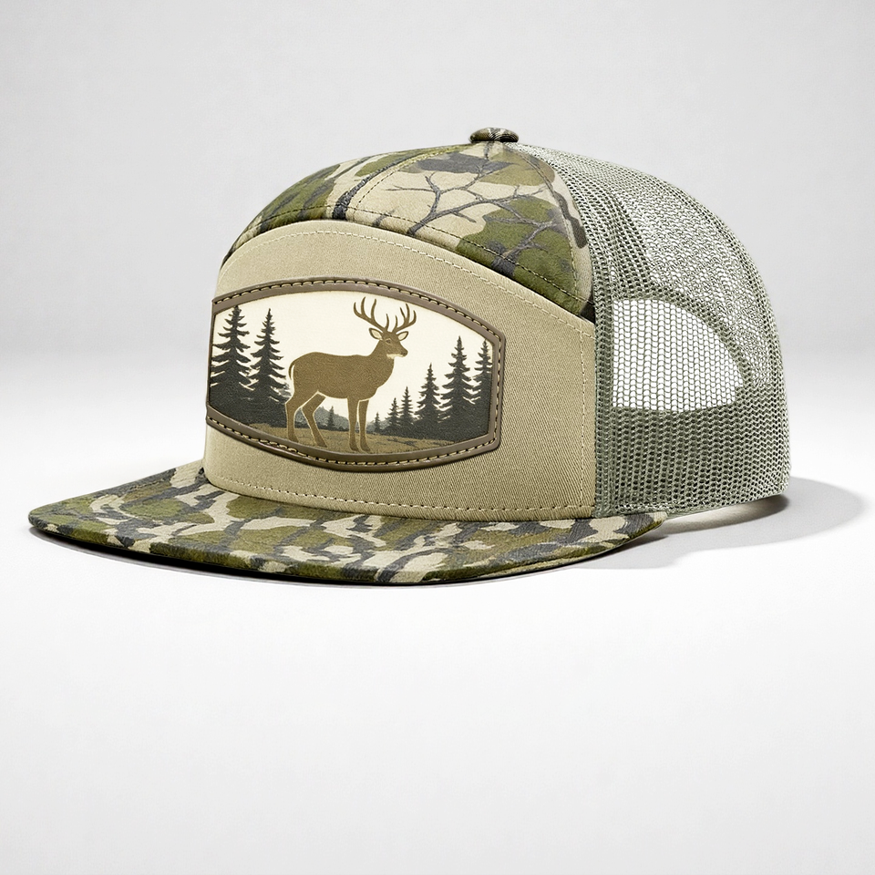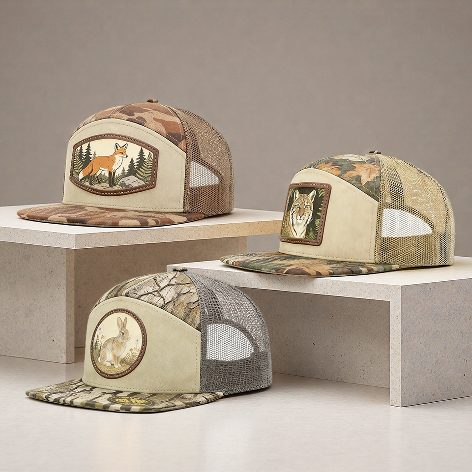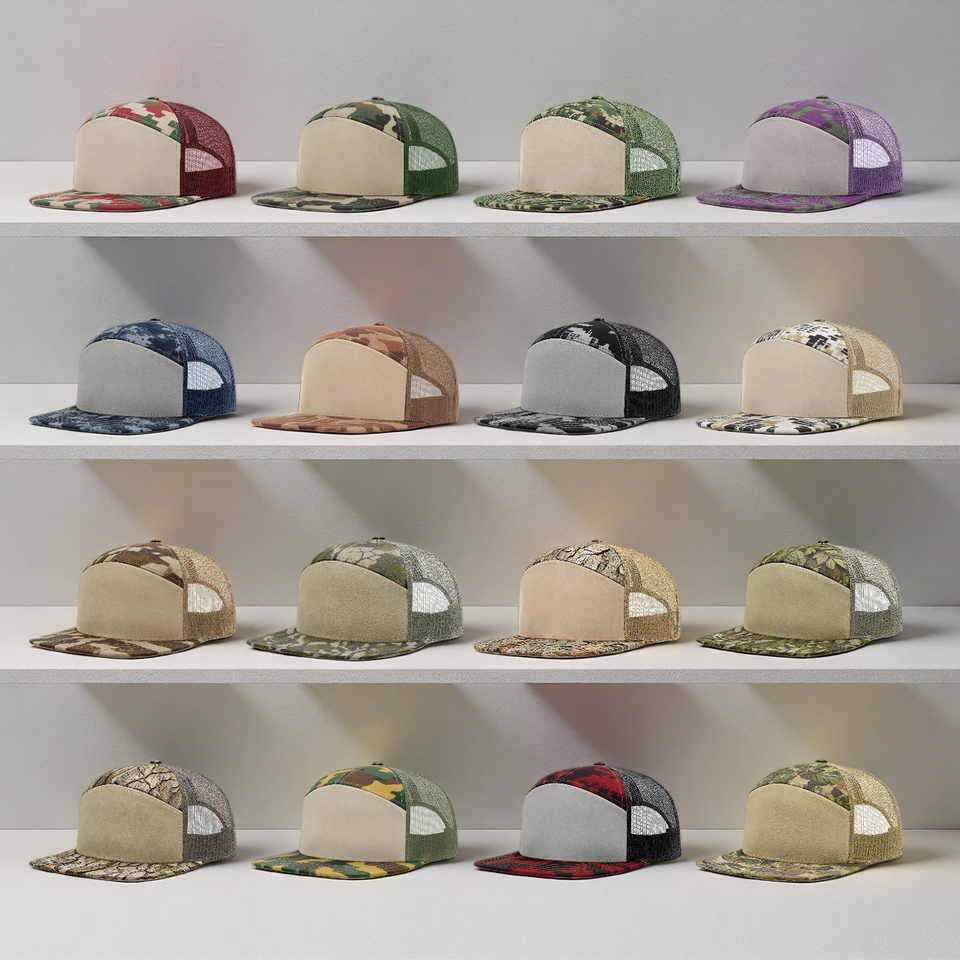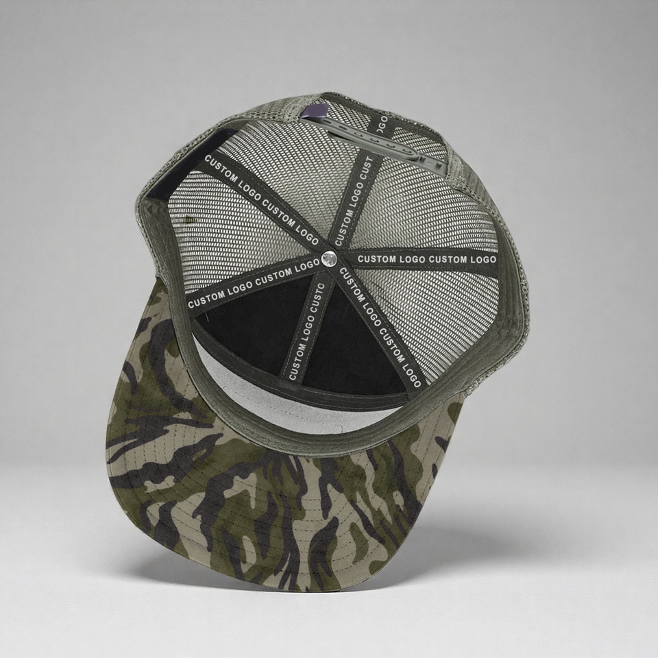 Gorras de Béisbol Personalizadas con Bordado en Cuero, Parche Tejido, 100% Algodón, Camuflaje, 7 Paneles, Cierre a Presión, Malla Trucker