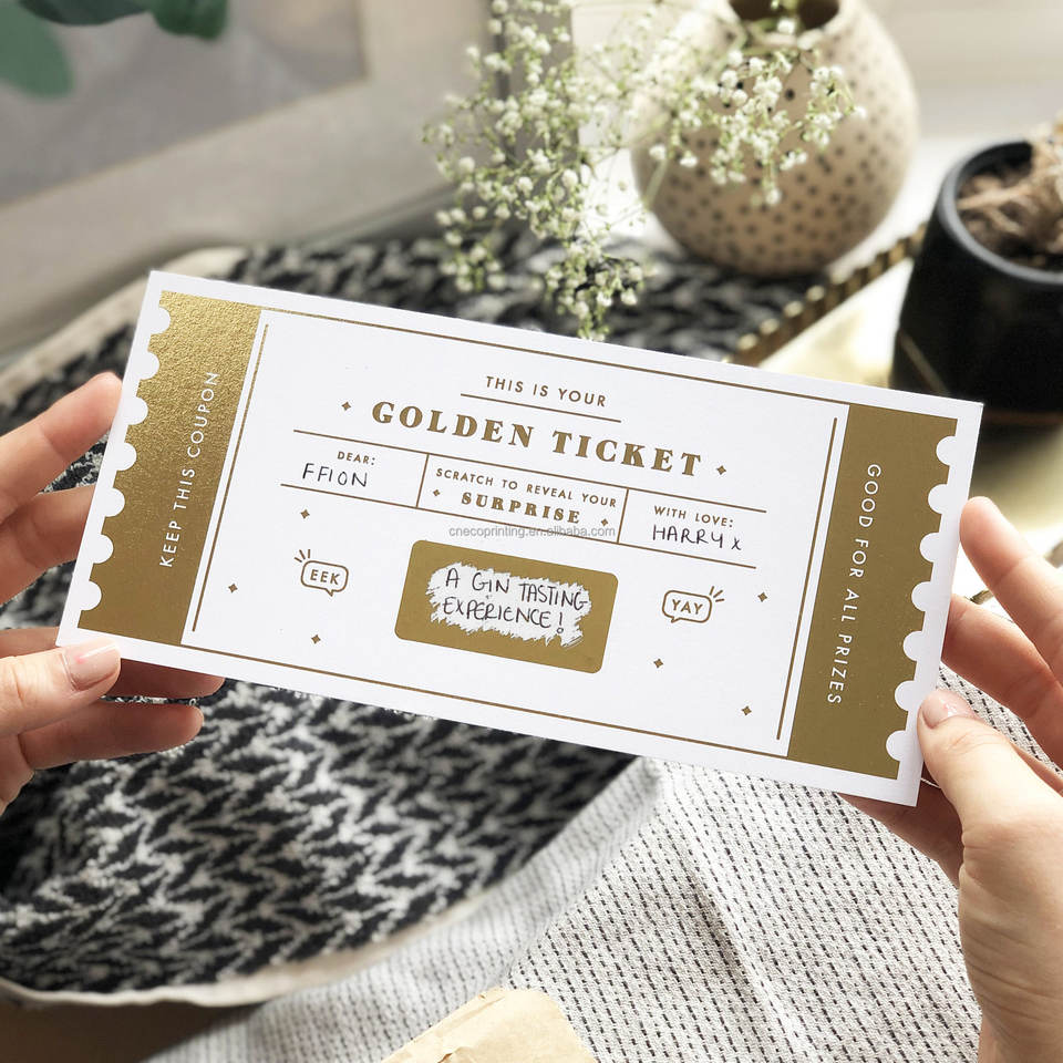 Impresión personalizada Reveal Surprise Gold Scratch Label Golden Card Ticket con sobre