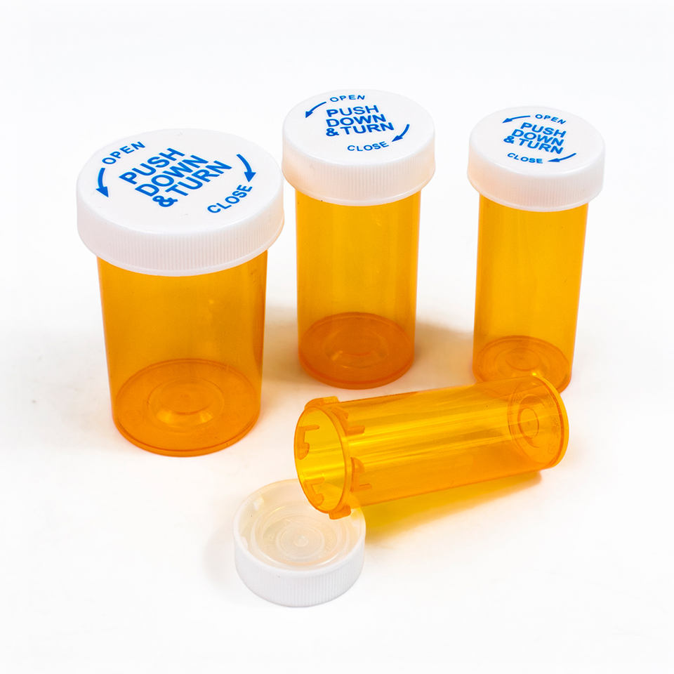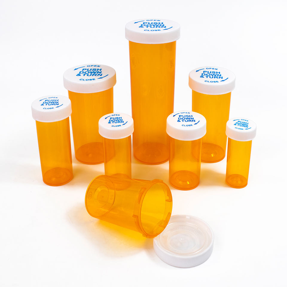 Viales de Plástico Naranja para Medicamentos con Logotipo Personalizado, de 6 a 60 Dram, con Tapa a Prueba de Niños con Sistema de Empujar y Girar