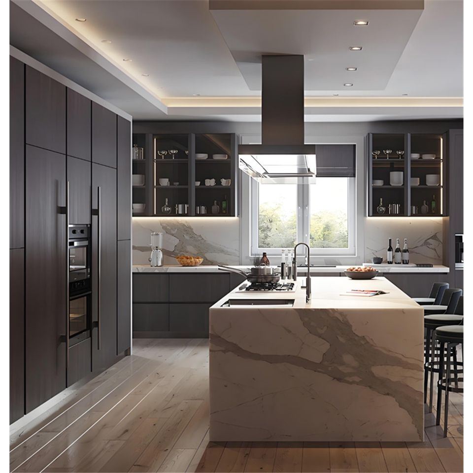 Armarios de cocina de madera maciza modulares listos para montar personalizados, armarios de cocina con acabado laminado de madera de arce modernos de lujo