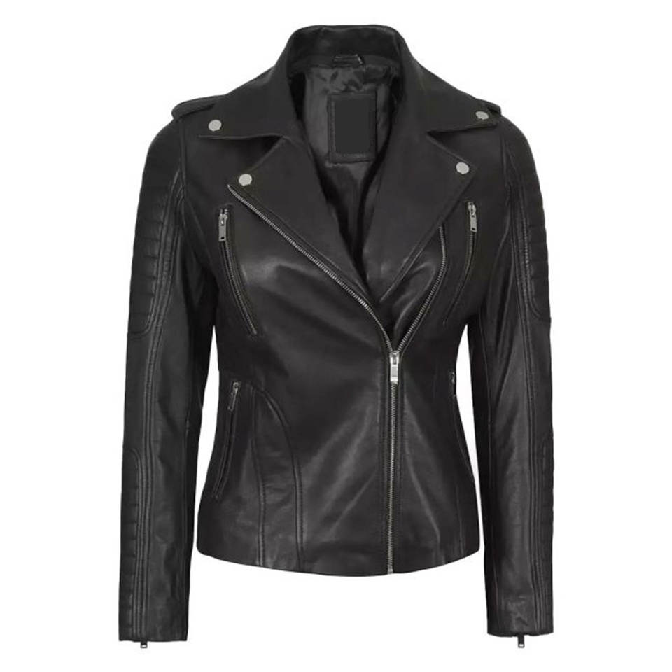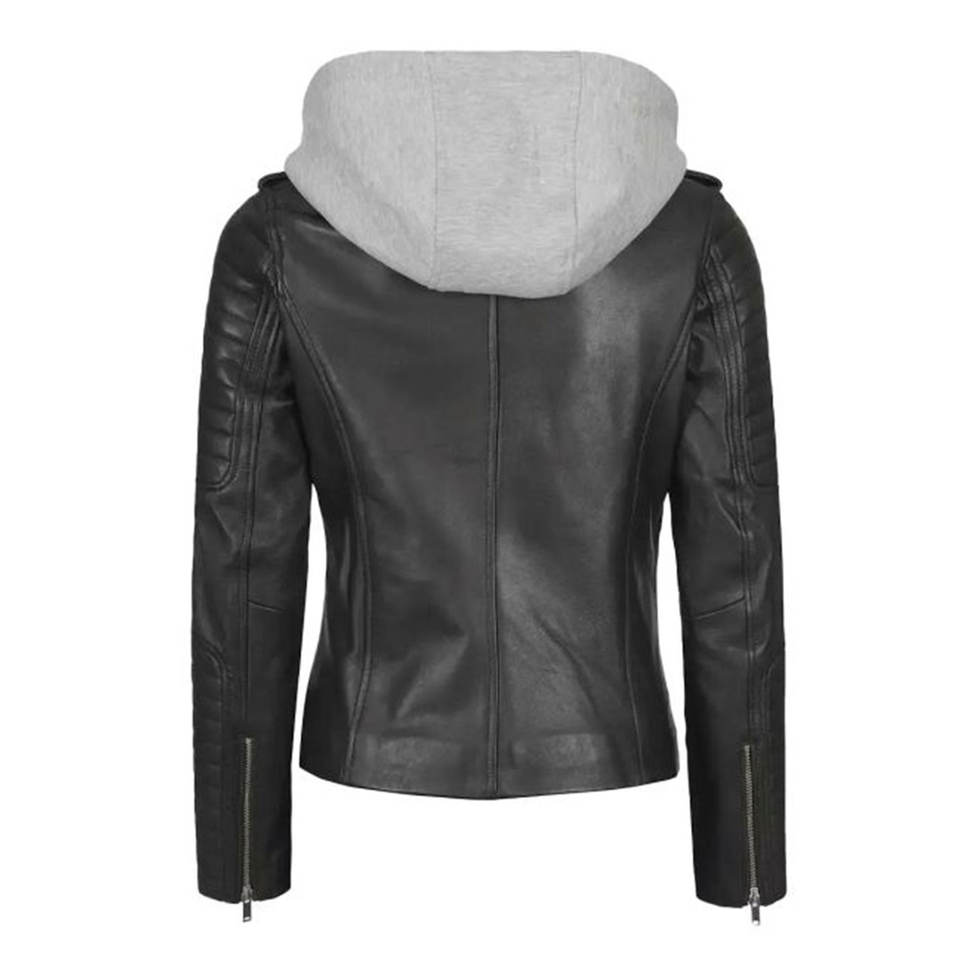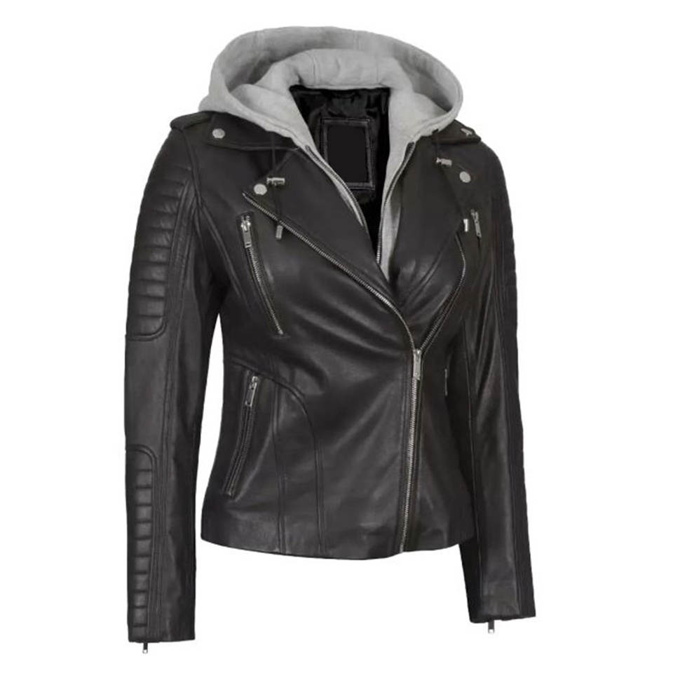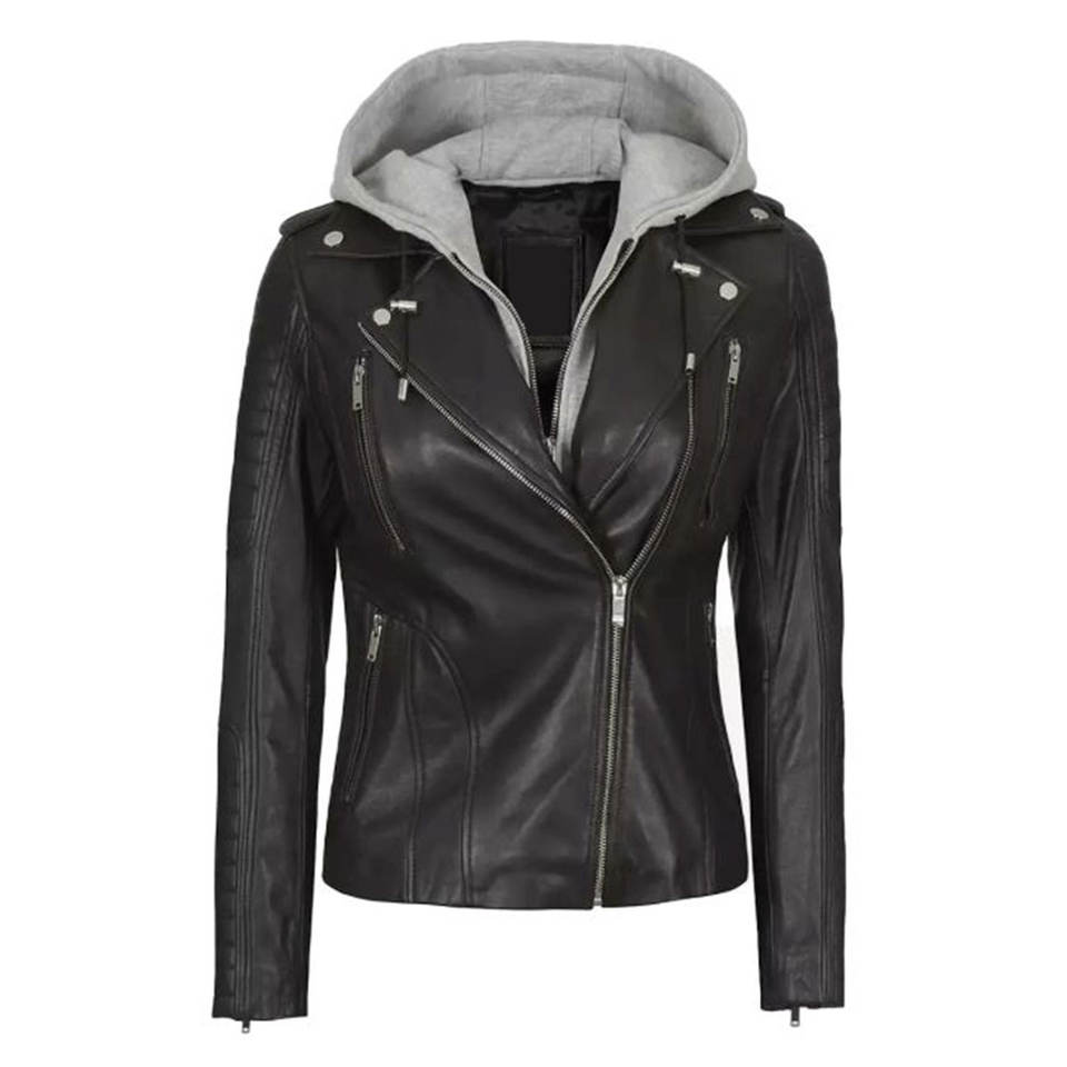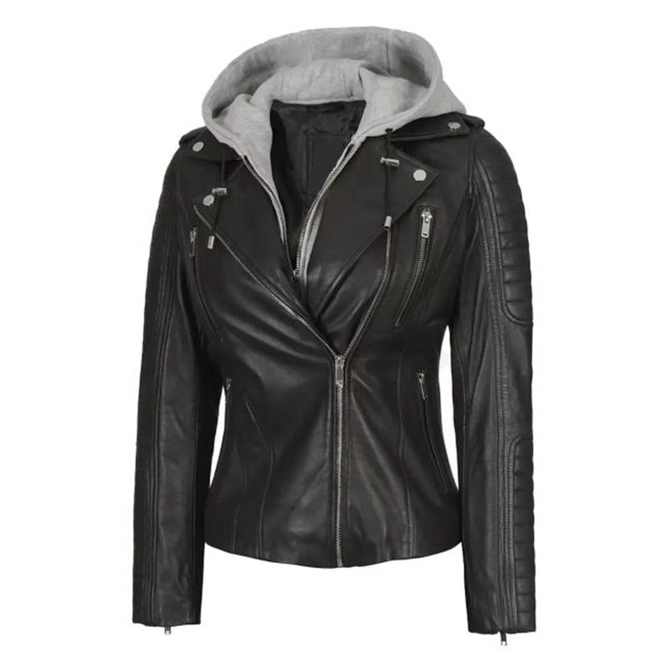 Chaqueta de Cuero de Cordero Real Personalizada para Mujer con Capucha Desmontable, Corte Asimétrico y Ajustado, Estilo Motero, Color Negro