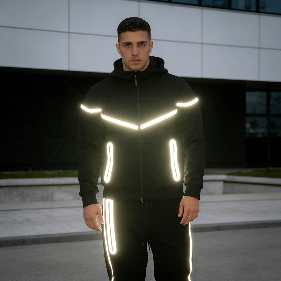Conjunto de Sudadera con Capucha Reflectante Personalizada para Hombre, Ropa Deportiva de Forro Polar Técnico, Fabricante de Ropa Deportiva Urbana con Franjas Luminosas