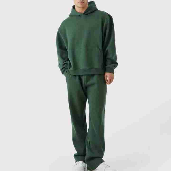 Conjunto de chándal de dos piezas personalizado, de peso pesado, con lavado ácido, color liso, que incluye sudadera con capucha tipo jersey y pantalones de chándal de pierna ancha