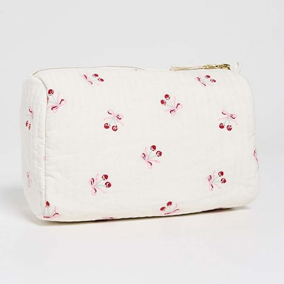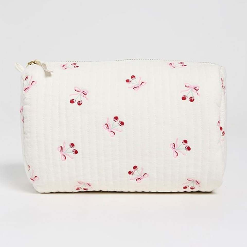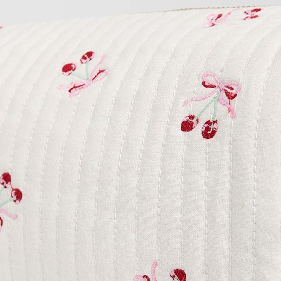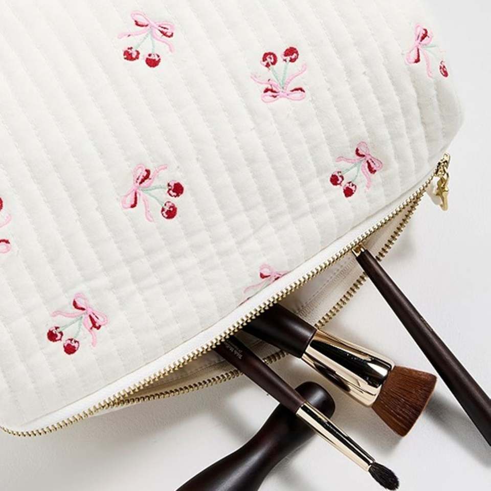 Bolsa de Cosméticos Personalizada Reutilizable, Blanca, Acolchada, de Algodón, con Lazo y Bordado de Cerezas, Gran Capacidad, con Cierre, Ecológica y Portátil para Mujer