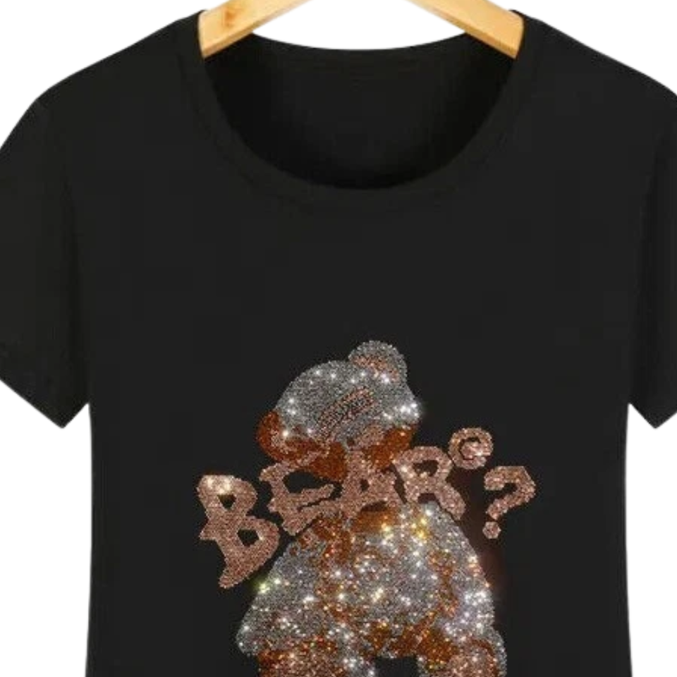 Camiseta con Diseño de Oso de Pedrería Personalizada, Diseño Brillante, Camiseta de Moda para Mujer, Ropa Urbana, Venta al por Mayor, OEM, Alta Calidad