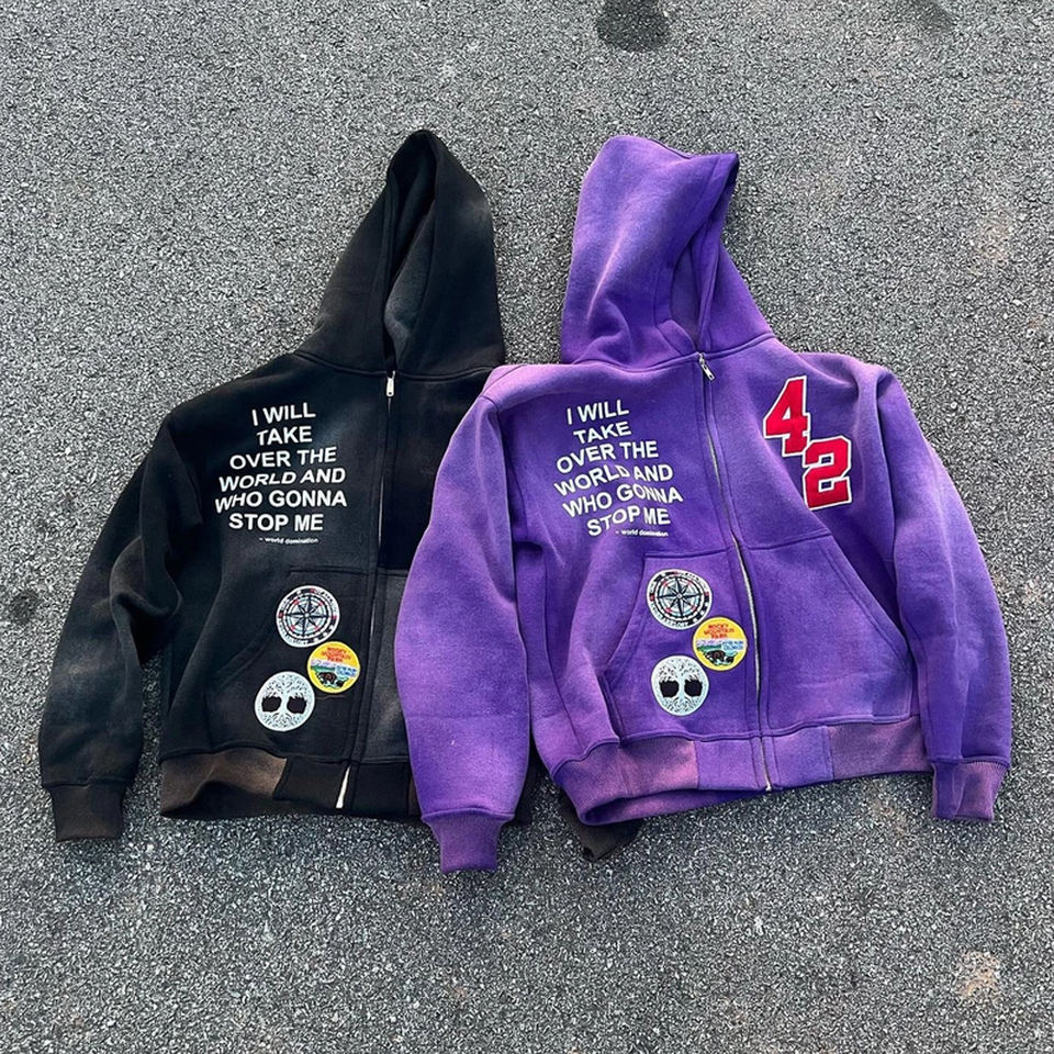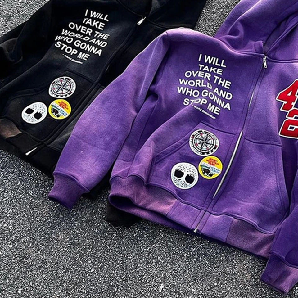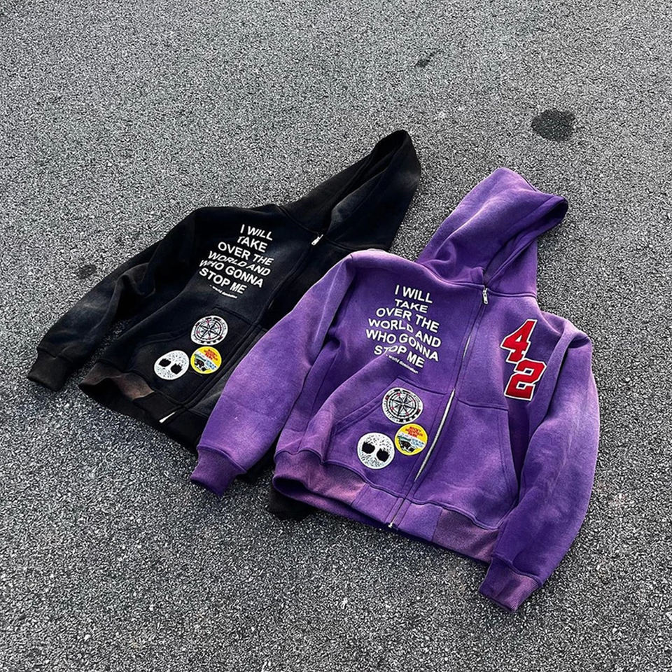 Sudaderas con Capucha y Cremallera para Hombre, 100% Algodón Tejido, Lavado Ácido, Efecto Desgastado por el Sol, con Parche de Chenilla y Pedrería Personalizada